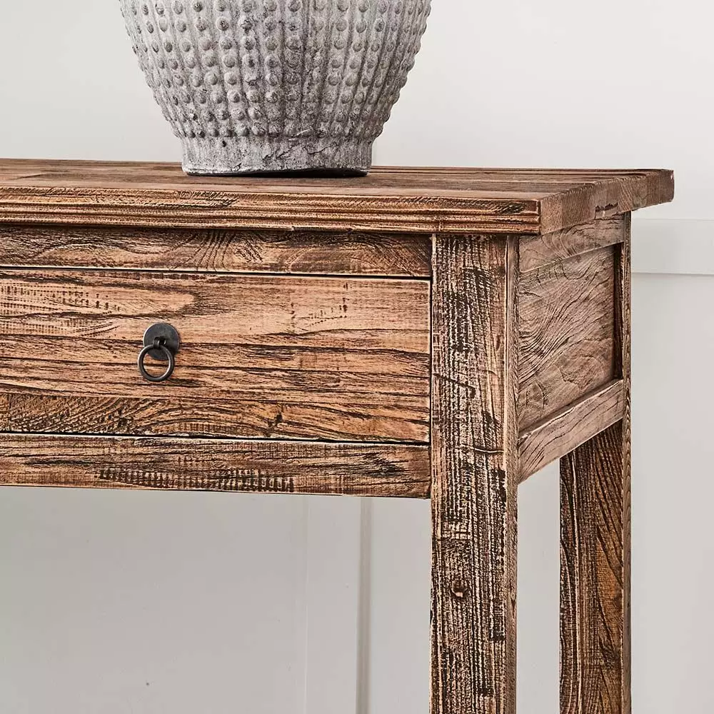 The generous scale of the elm sofa table is complemented by the rustic reclaimed elm used to make it. It’s a solid piece, with 4 handy drawers making it suited to many rooms in your home.