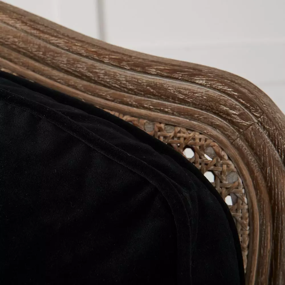 A classic French design from the Louis XV era, with a handcrafted oak frame and upholstered in a luxurious black velvet with a piping trim. The oak frame is complemented beautifully by the woven rattan back. The foam cushioning is covered with a mixture of feather and polyester fibre for an extra comfortable seat.