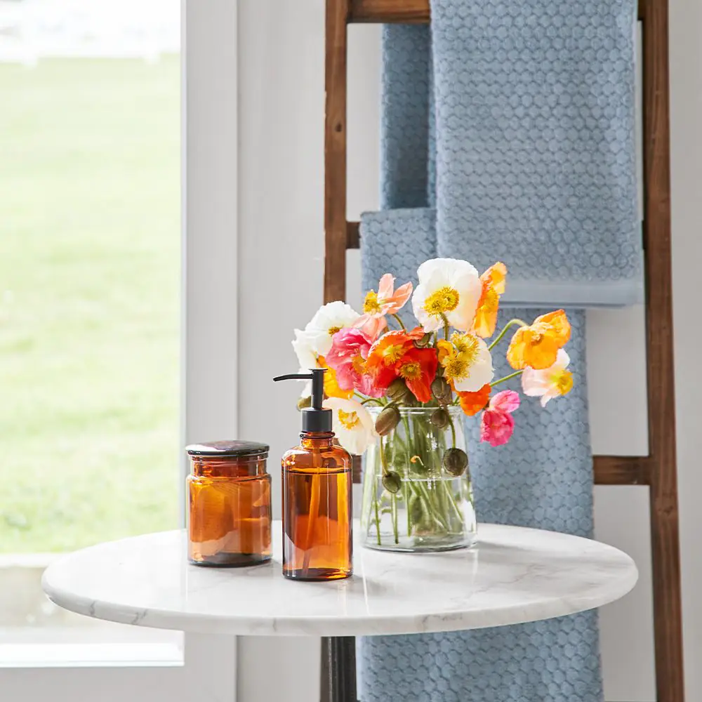 Our Apothecary range is inspired by the classic silhouettes and warm tones of old-world apothecary jars, updated with a sleek finish for the modern bathroom. This Amber Glass Dispenser serves as a functional piece of decor, bringing a sophisticated, rustic aesthetic to your sink-side setup.