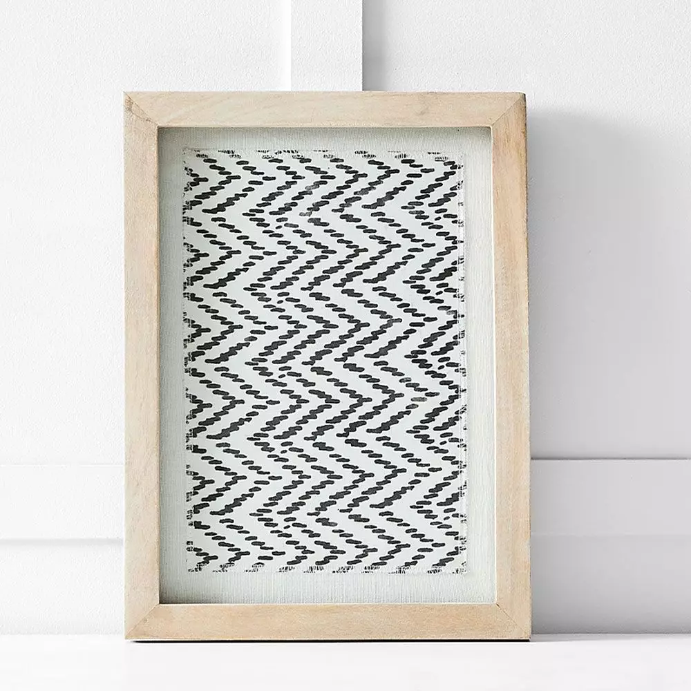 A selection of different black and white fabrics beautifully framed in Mango Wood, and kept safe under glass. These small prints make a statement alone and lend themselves to hanging in multiples.