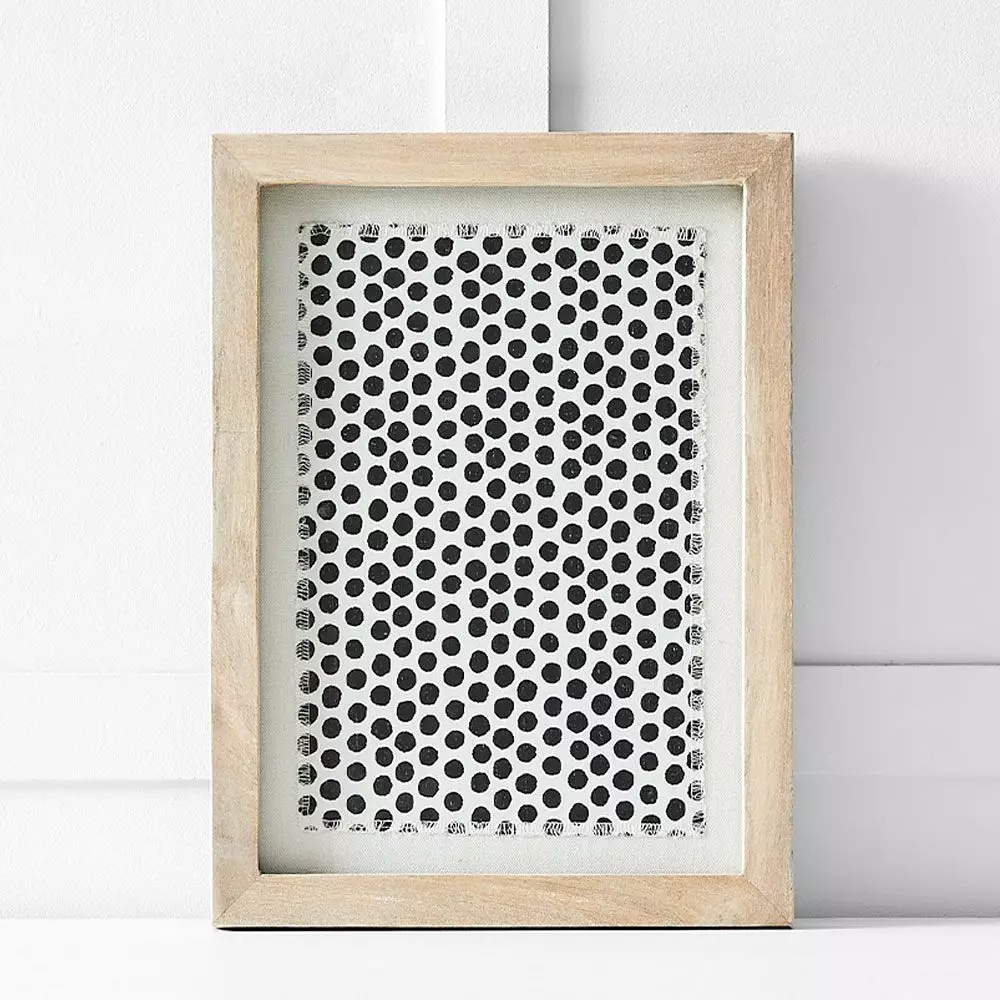 Visual Details: This piece features a striking selection of black and white fabrics with a distinct spot pattern, beautifully showcased within a natural Mango Wood frame. Each print is protected under high-quality glass, ensuring the intricate textile details remain preserved while adding a layer of gallery-style depth.