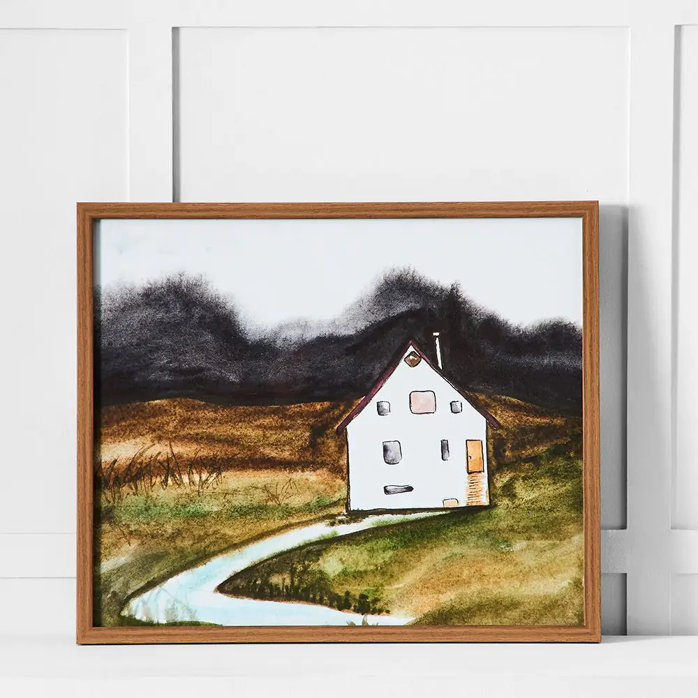 The image portrays a home at the end of a road, evoking a sense of mystery and introspection. The moody tones of the print invite you to imagine various stories and emotions connected to the scene. A very contemplative print to add to your art collection.