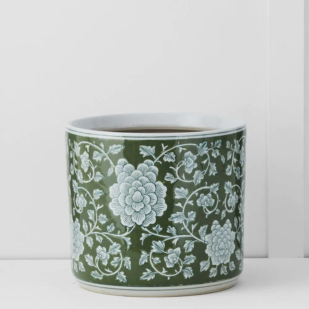 This lovely ceramic planter is decorated with a bold floral design in white on a green background – bringing a breath of fresh air into your home. It’s beautiful enough to display as it is, but perfect for pot plants or filled with flowers.