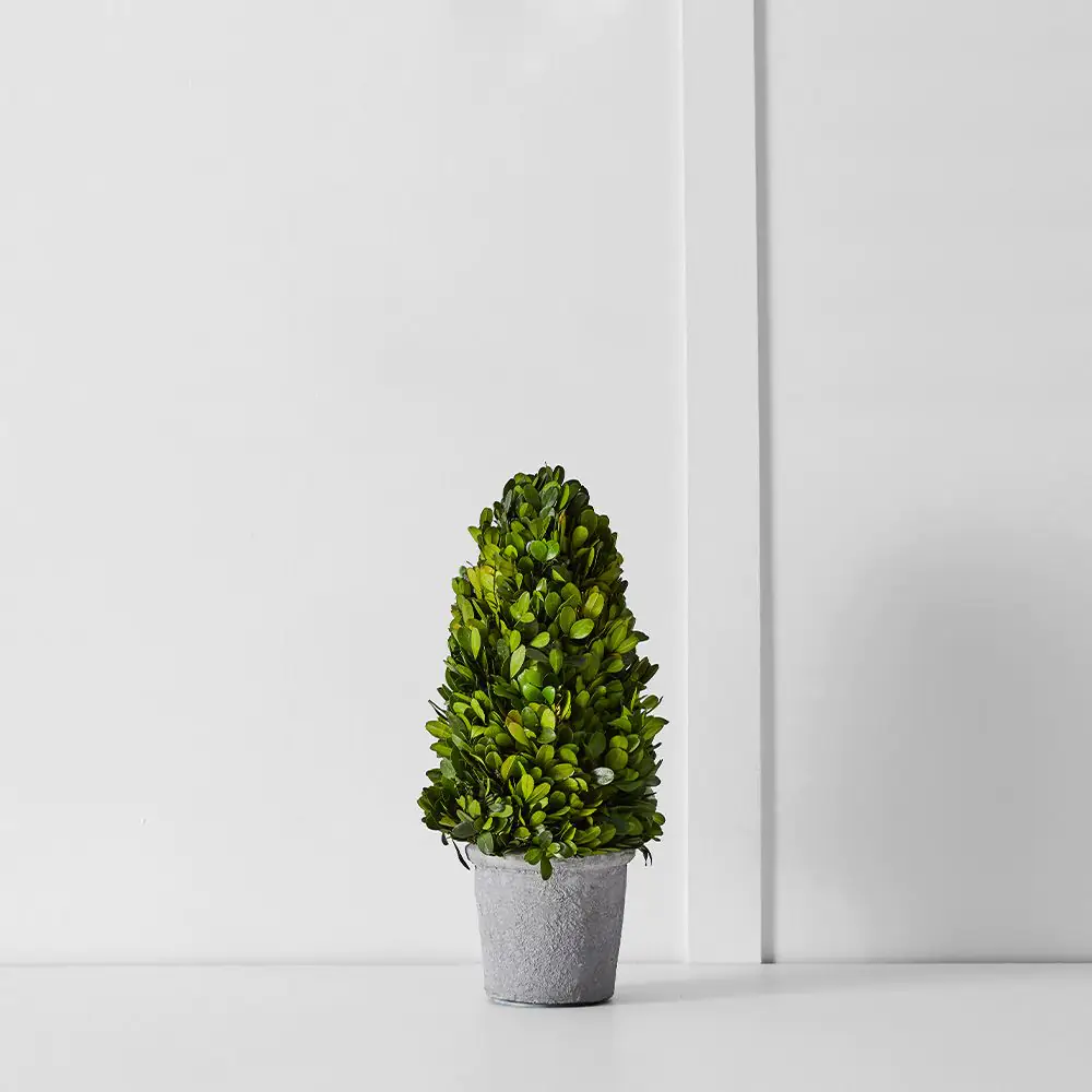 Visual Details & Design: Meticulously crafted from authentic preserved boxwood, this 34cm cone-shaped tree features deep evergreen foliage that retains its vibrant color and fresh appearance without the need for watering. The tree is delicately wrapped in battery-powered fairy lights, providing a warm sparkle that highlights the intricate textures of the leaves.