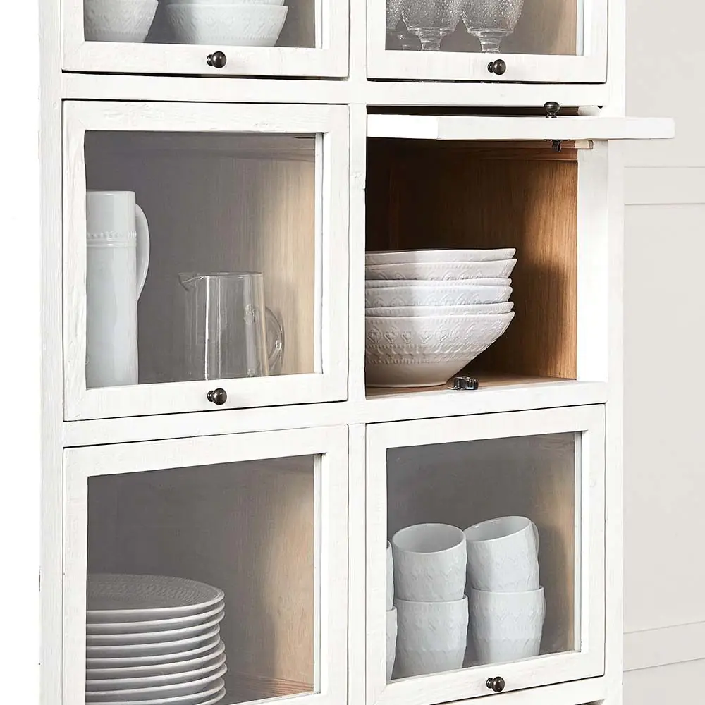 The lift up and push back glass doors are a unique feature and add to the overall appeal. The reclaimed pine is painted white while the inside is an oak veneer which lets the timber grain do the talking while showcasing items on display.