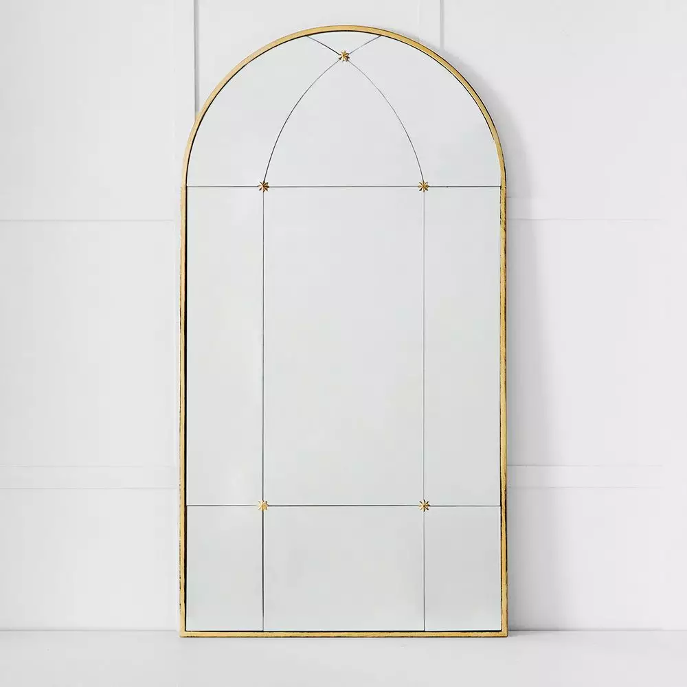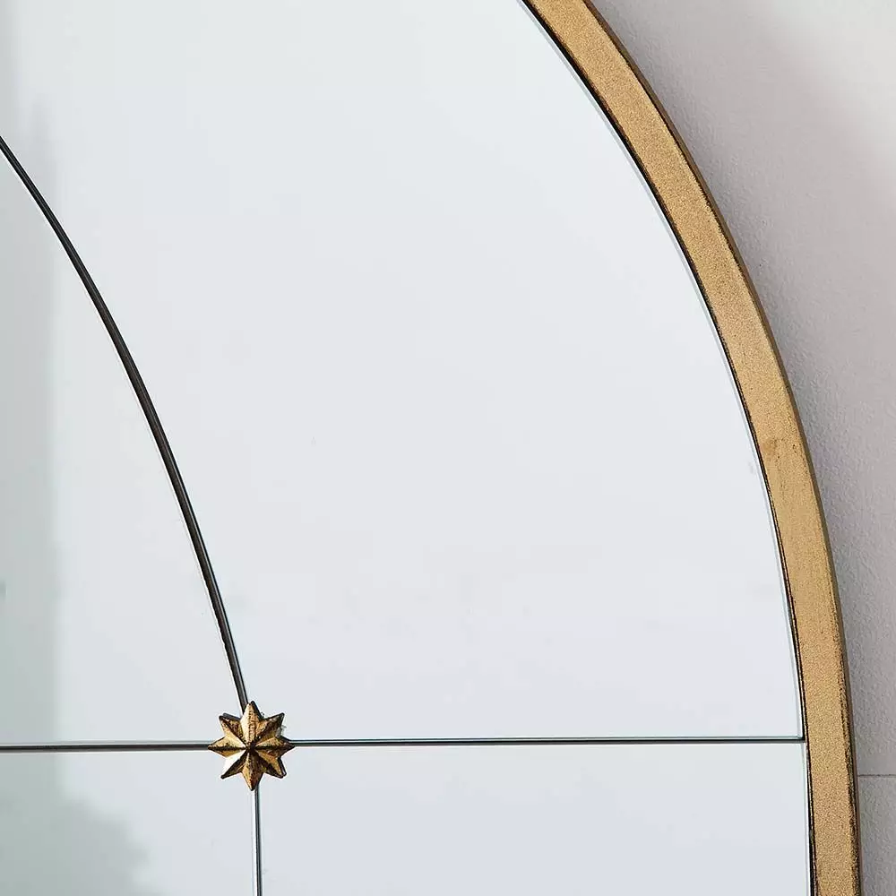 This beautiful curved mirror with gold star detail will make an elegant statement in any room. The thin gold frame adds a touch of opulence.