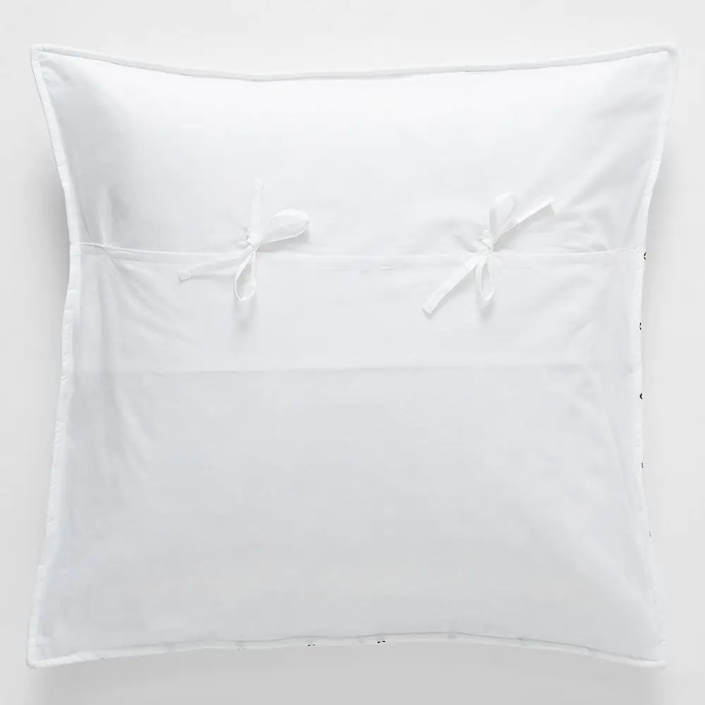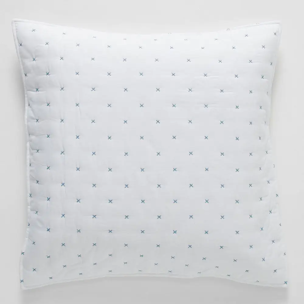 A simple white cotton sham with a cloud blue cross stitch detail adds some subtle texture and colour to your bed. Pick up the accent colour with some accessories – sheets, cushions, pillowcases or a throw. A plain white back with ties completes the sham beautifully.