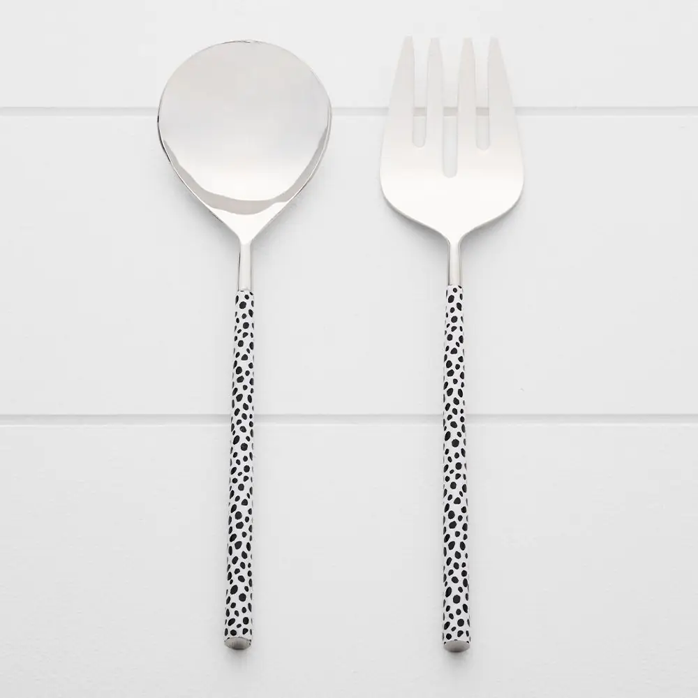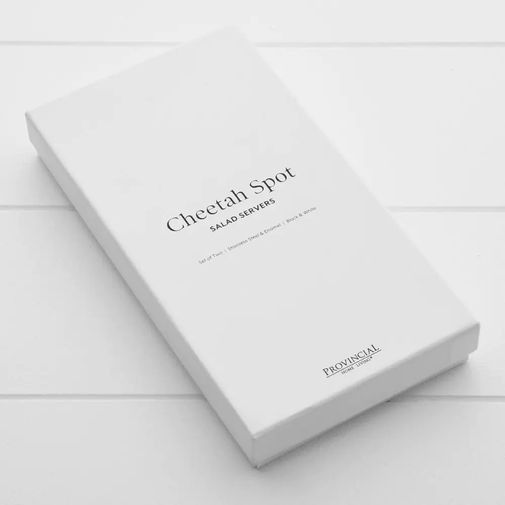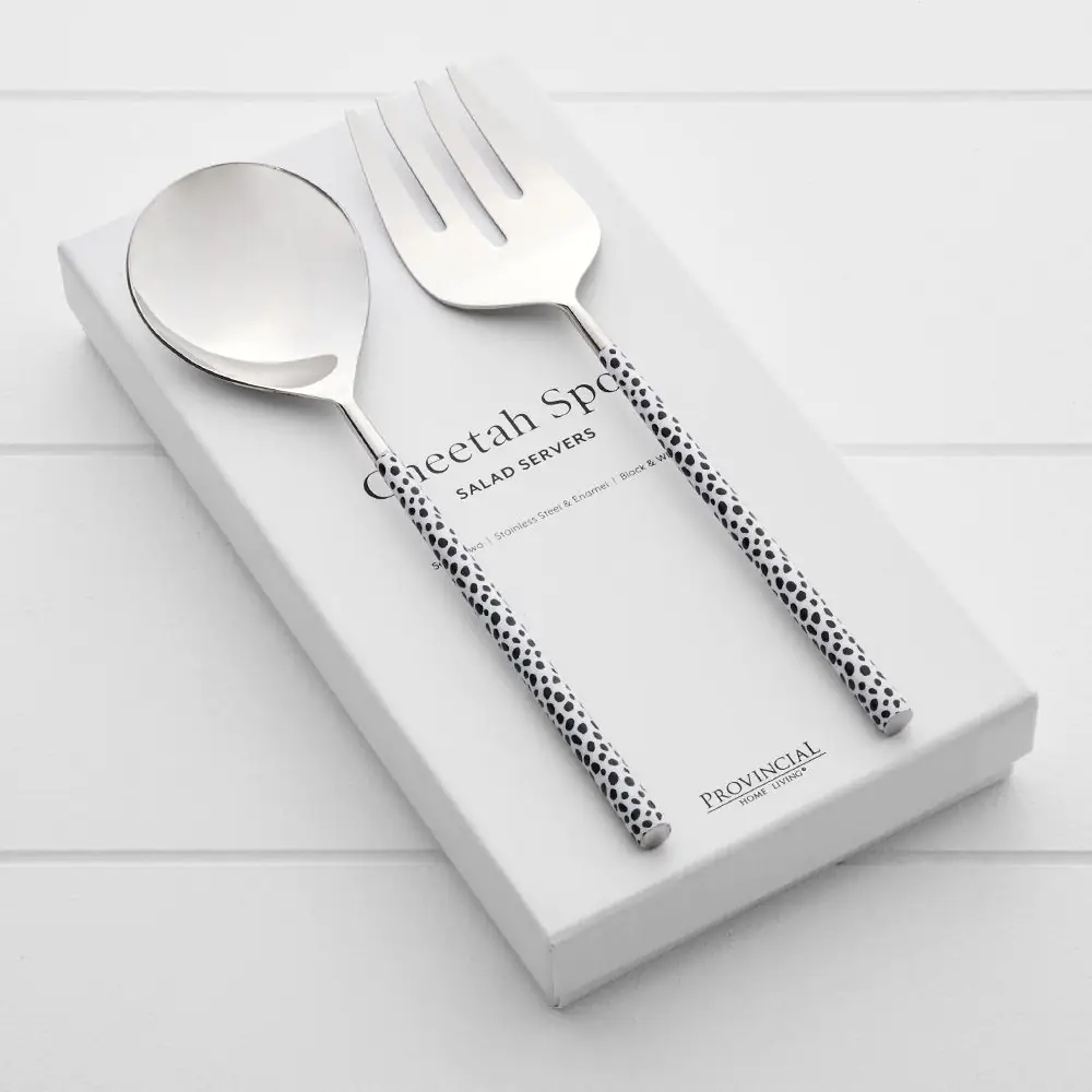 Our boxed salad server set is crafted from stainless steel with natural and black cheetah spot enamel-coated decals, adding a touch of charm.