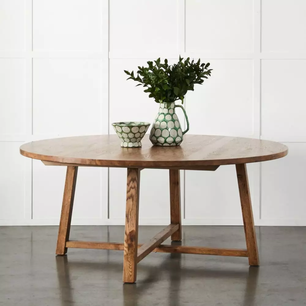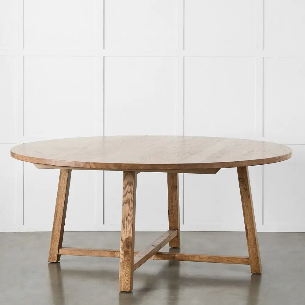 Connor is a round dining table with a substantial, solid top. The wonderful grain which is inherent in oak and the four legs with cross supports combine to make this an exquisite table. It comfortably seats 6.
