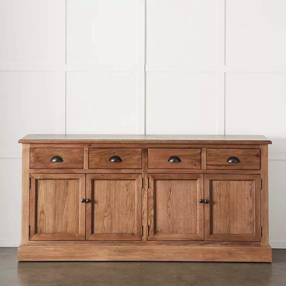 A beautifully crafted oak buffet with 4 handy drawers and 4 doors. finished with zinc alloy door pulls and handles. The cupboards have a centre shelf for extra storage. At 180cms wide it is the perfect piece for living, dining or family rooms.