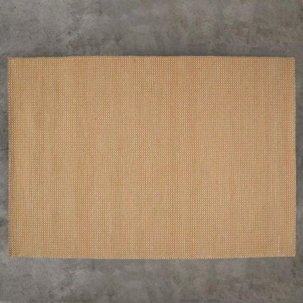 This beautiful woven wool rug in textured saffron and natural hues will add a warming touch to any room.