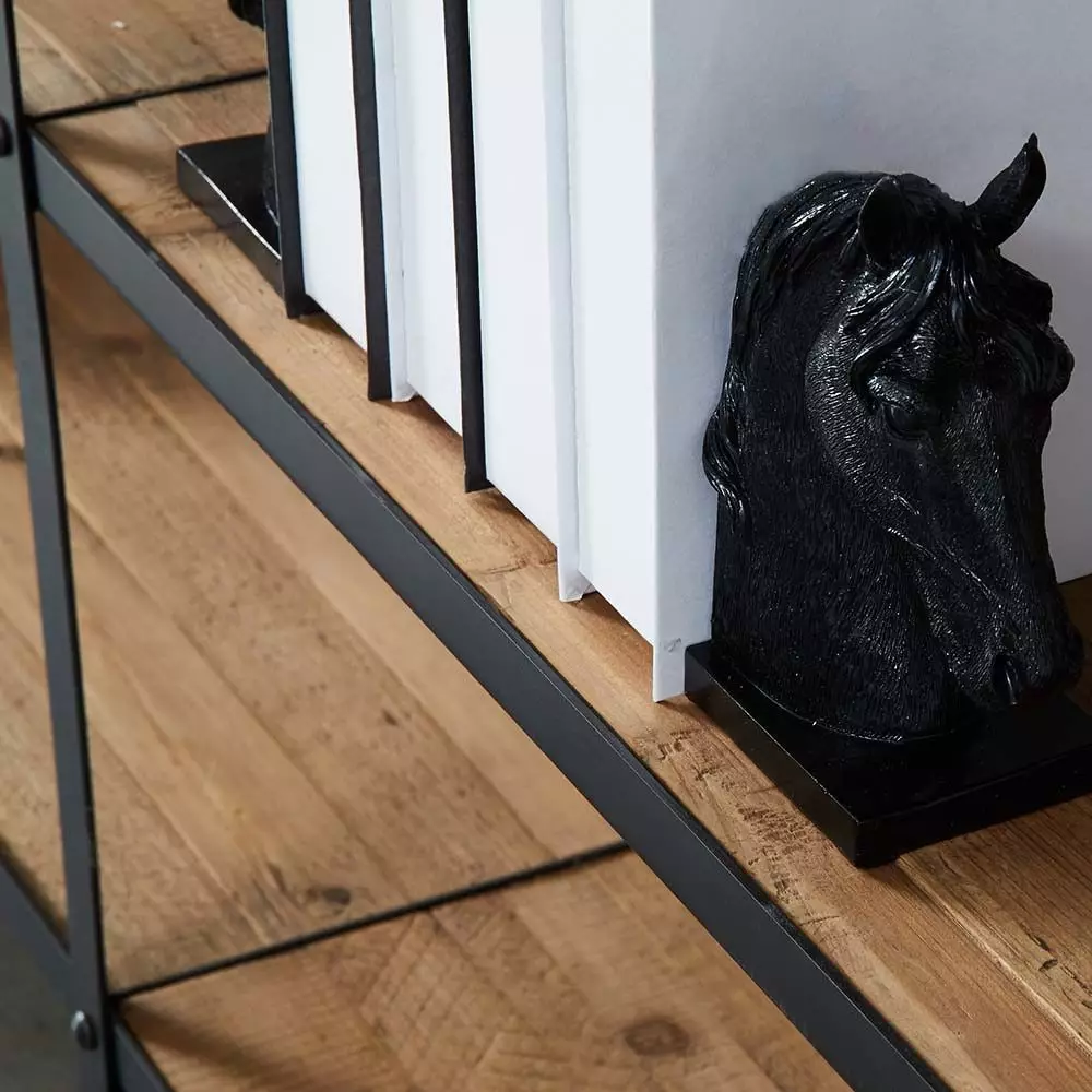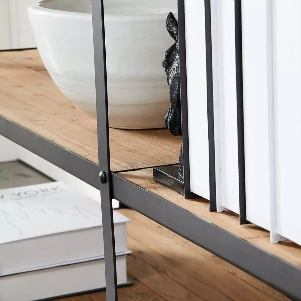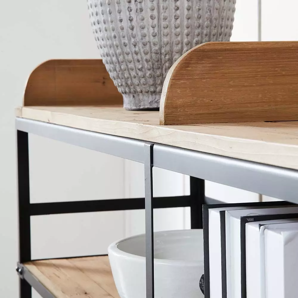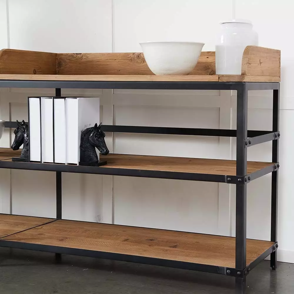 With great presence, the Finley console is a versatile piece crafted from reclaimed fir and iron. The top has a has an edge around three sides to prevent things falling off, and the two handy shelves are wide enough to display coffee table books.