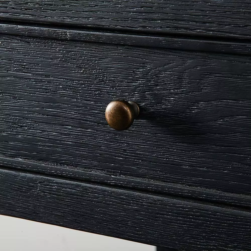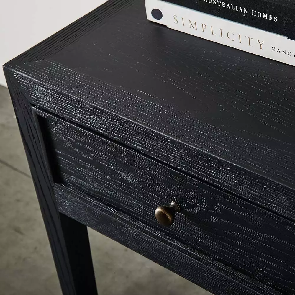 The Fitzroy bedside table is crafted from oak and washed in black, so the grain is still apparent and part of the appeal of the piece.