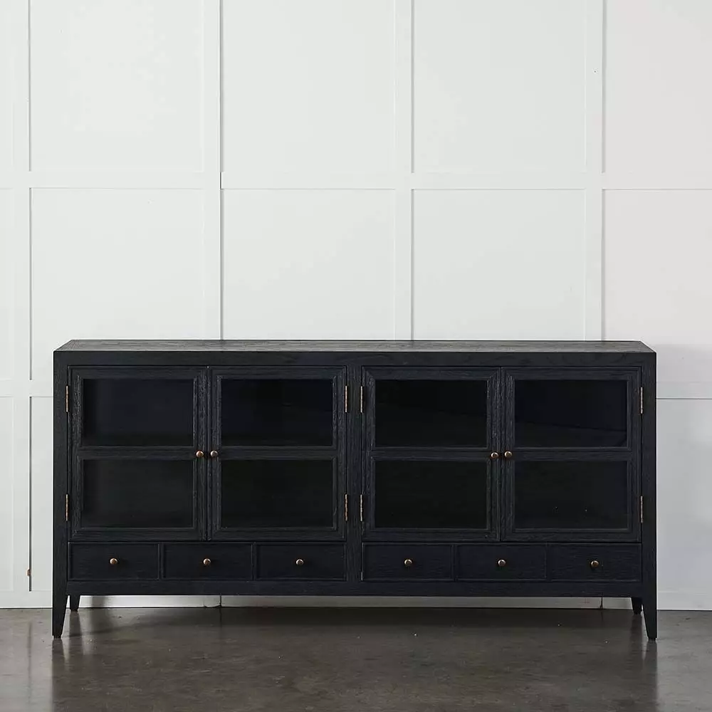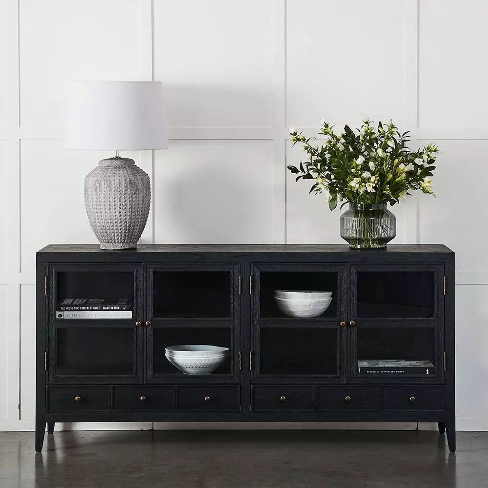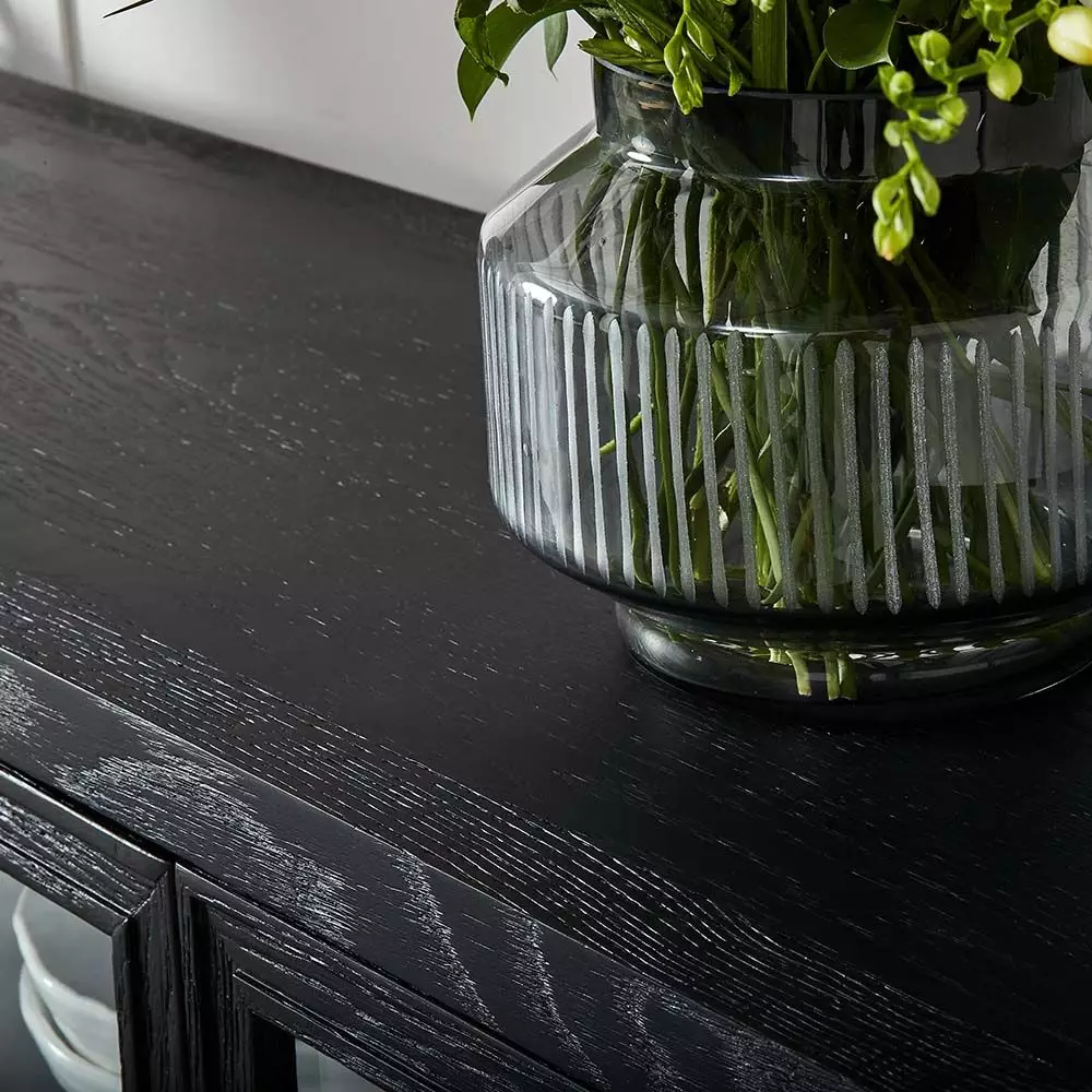 The Fitzroy sideboard is crafted from oak and washed in black so the grain is still apparent and part of the appeal of the piece.