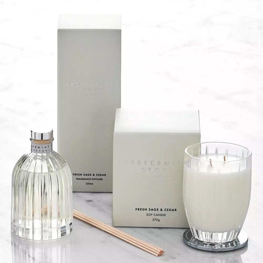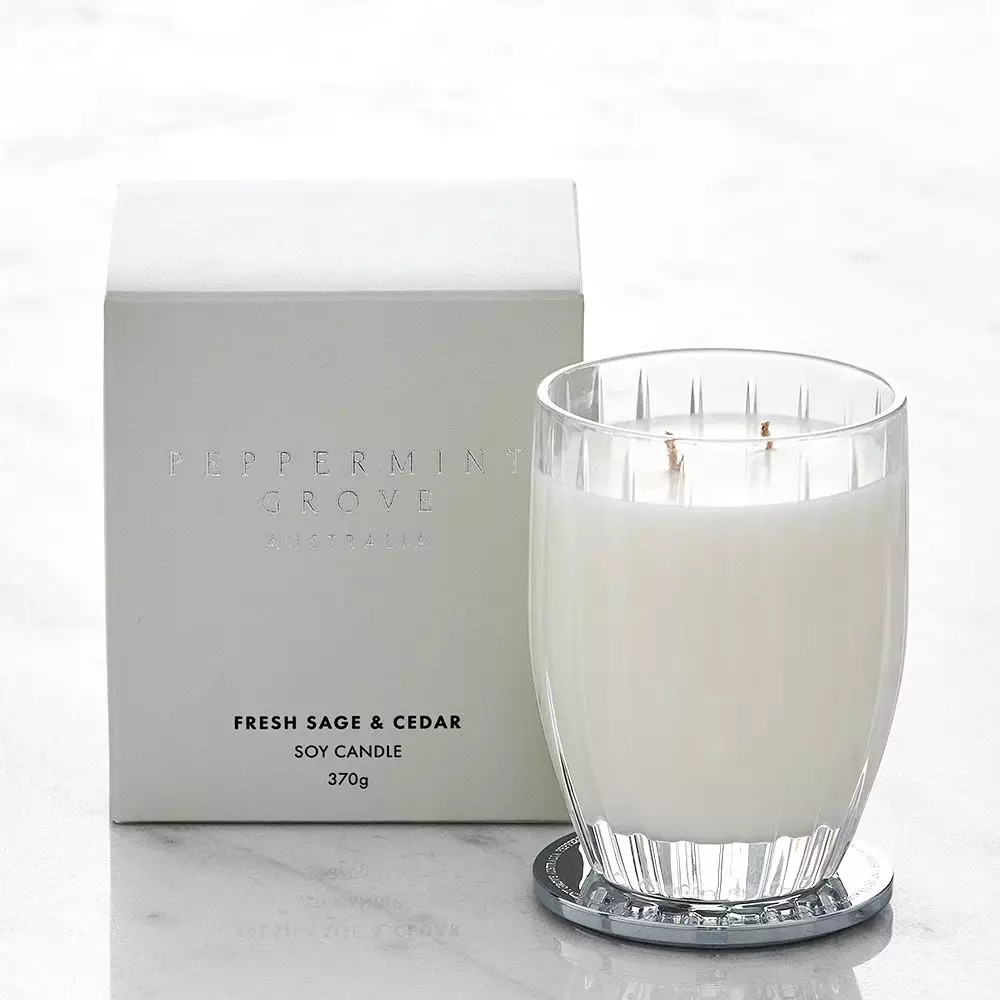 Featuring the crisp, herbal notes of fresh sage balanced by the deep, grounding aroma of cedarwood, this candle is housed in a custom-designed glass vessel that complements any bathroom or living space decor.