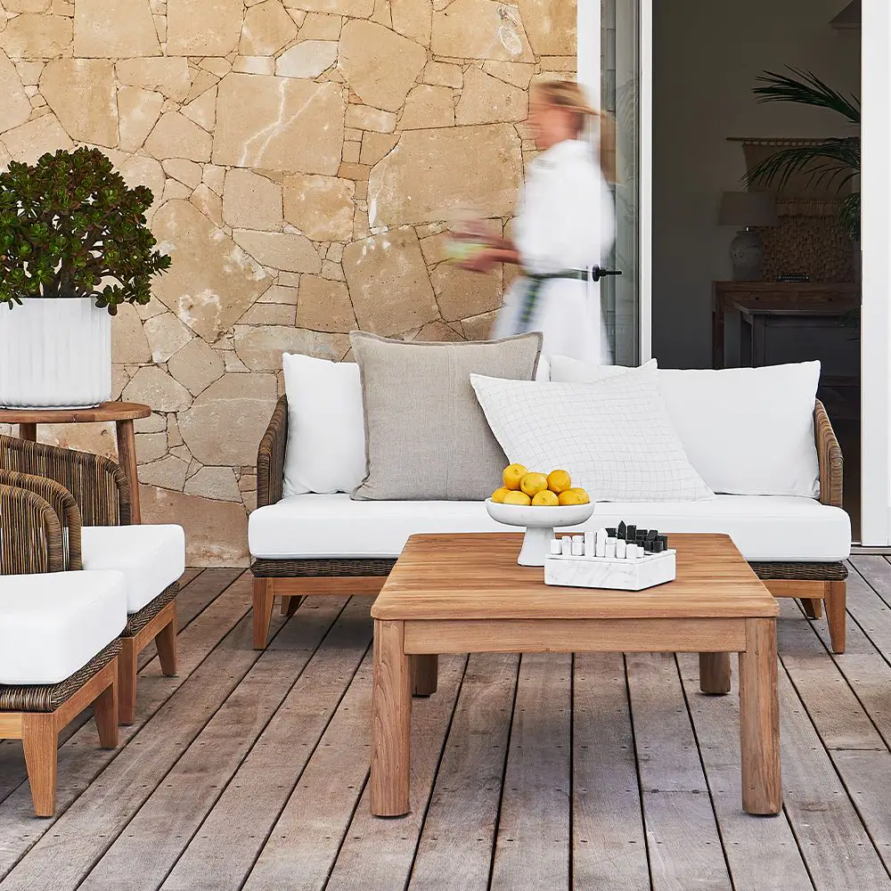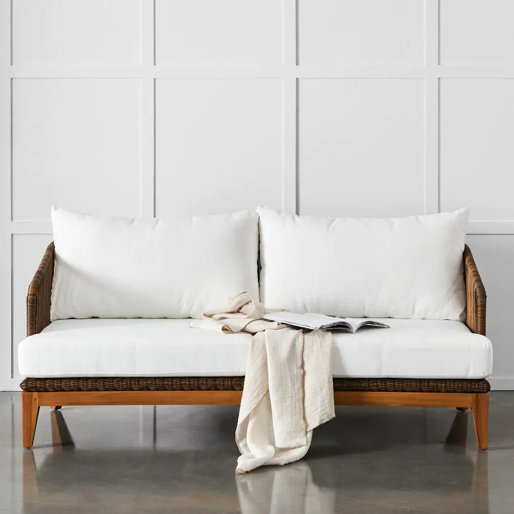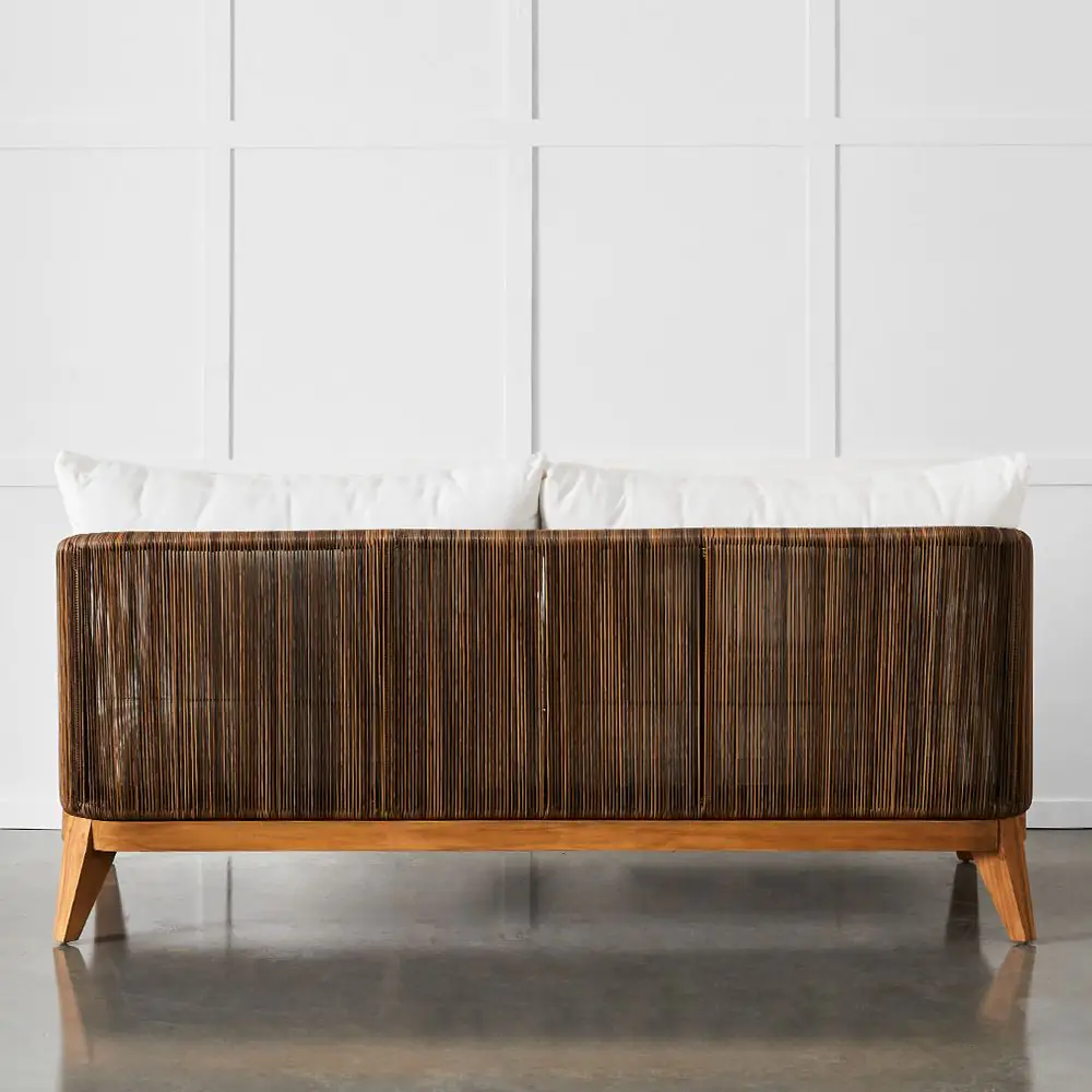 Complete your outdoor sanctuary with the Genoa Sofa. Crafted with a robust teak frame and wrapped in UV-resistant synthetic wicker, this sofa is made to endure the elements gracefully. Plush cushions upholstered in Olefin sunproof fabric offer superior comfort while resisting fading from sun exposure. The Genoa Sofa marries timeless design and premium materials and brings lasting elegance and relaxation to any outdoor setting.