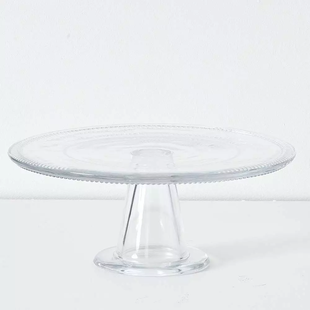 A pretty glass cake stand with a delicate beaded pattern on the rim of the plate to highlight your culinary skills.