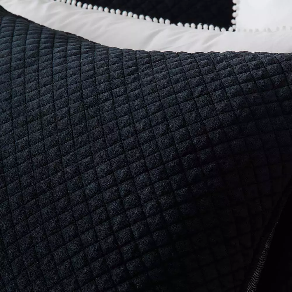 This luxurious black velvet sham is quilted in the traditional French boutis manner but is given a more modern look with diamond shaped embroidery. The reverse is a black chambray fabric which is closed with ties.
