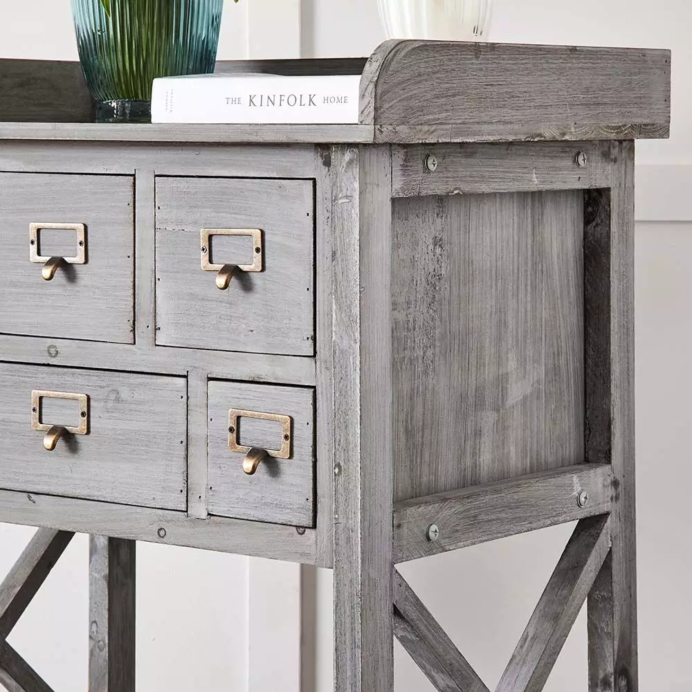 The charming Henry side table is an ideal storage solution in small hallways, living rooms or as a rustic bedside table. Constructed from natural fir with a soft grey wash. With a tray top and 6 handy drawers there’s room for display and hiding to keep rooms neat.