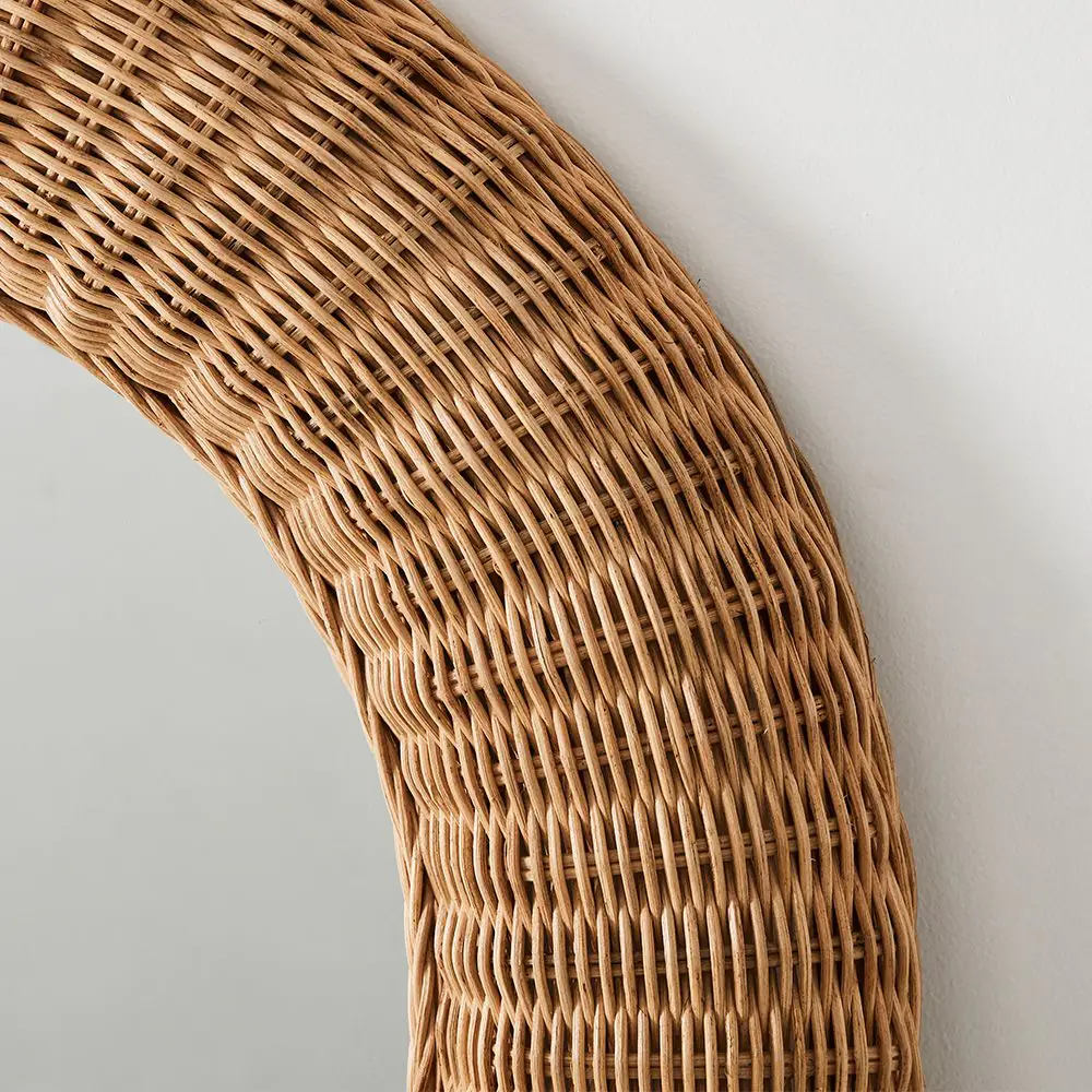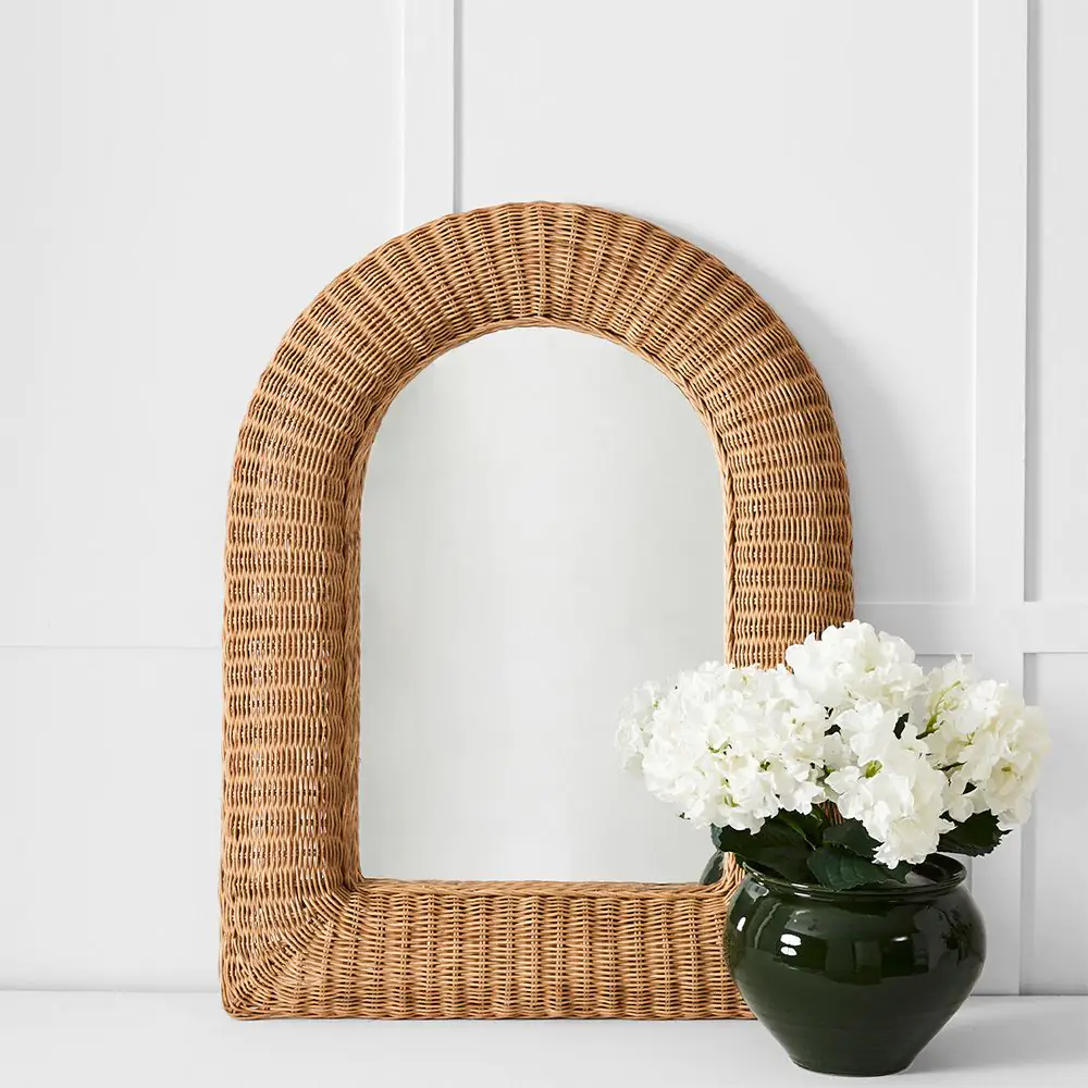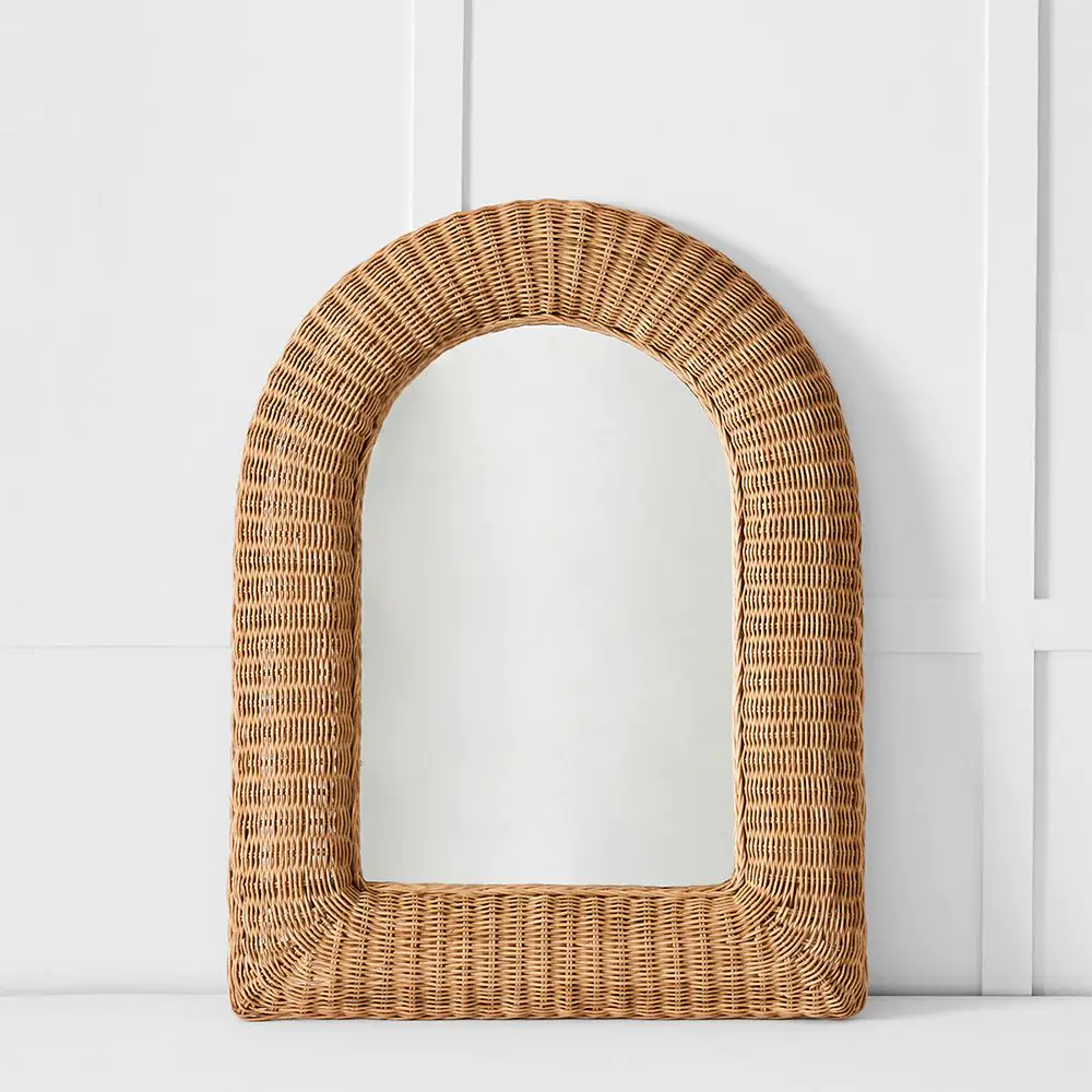 Our Indra range is skilfully handwoven, showcasing the natural textures and warm, honey-coloured hues of rattan. This arched mirror, framed in intricately woven rattan, brings a graceful silhouette and natural charm to your space. Its elegant curve and handcrafted detail make it a beautiful statement piece for a hallway, bedroom, or living area.