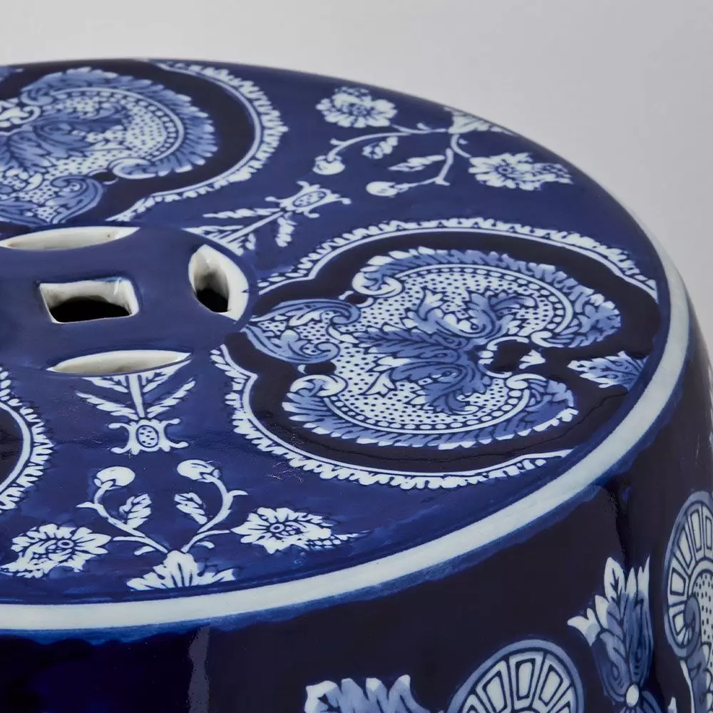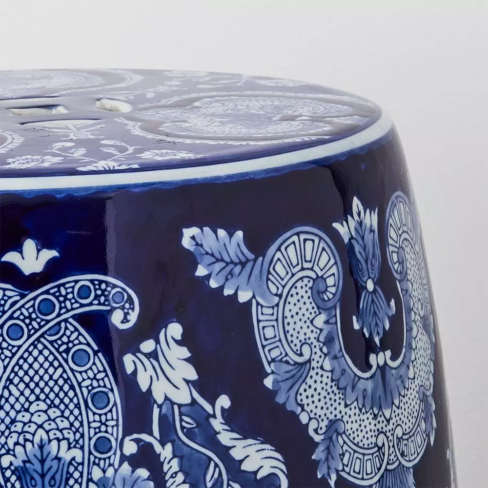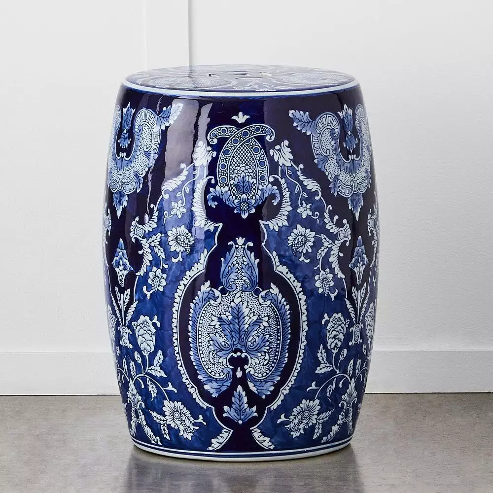 The Jardine ceramic stool in indigo, Ming blue and white will make a statement in any room. Use it as a side table or extra seating.