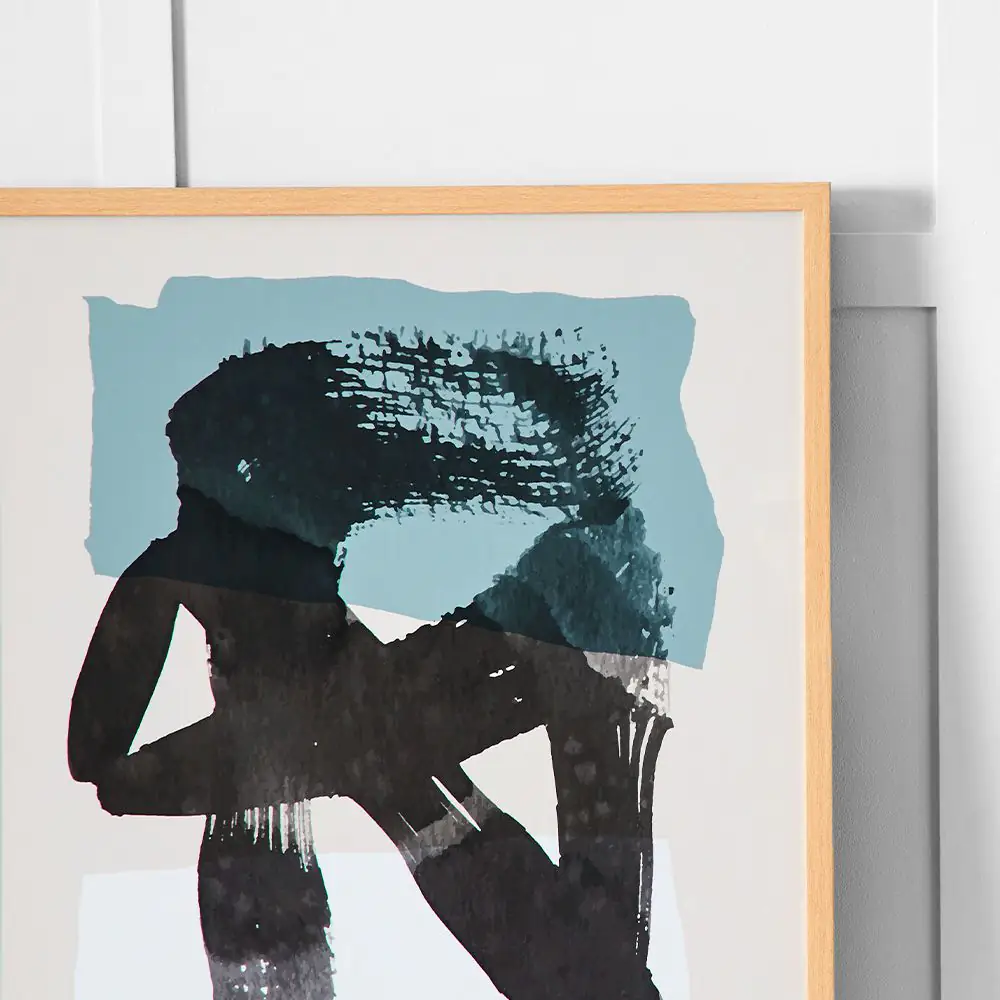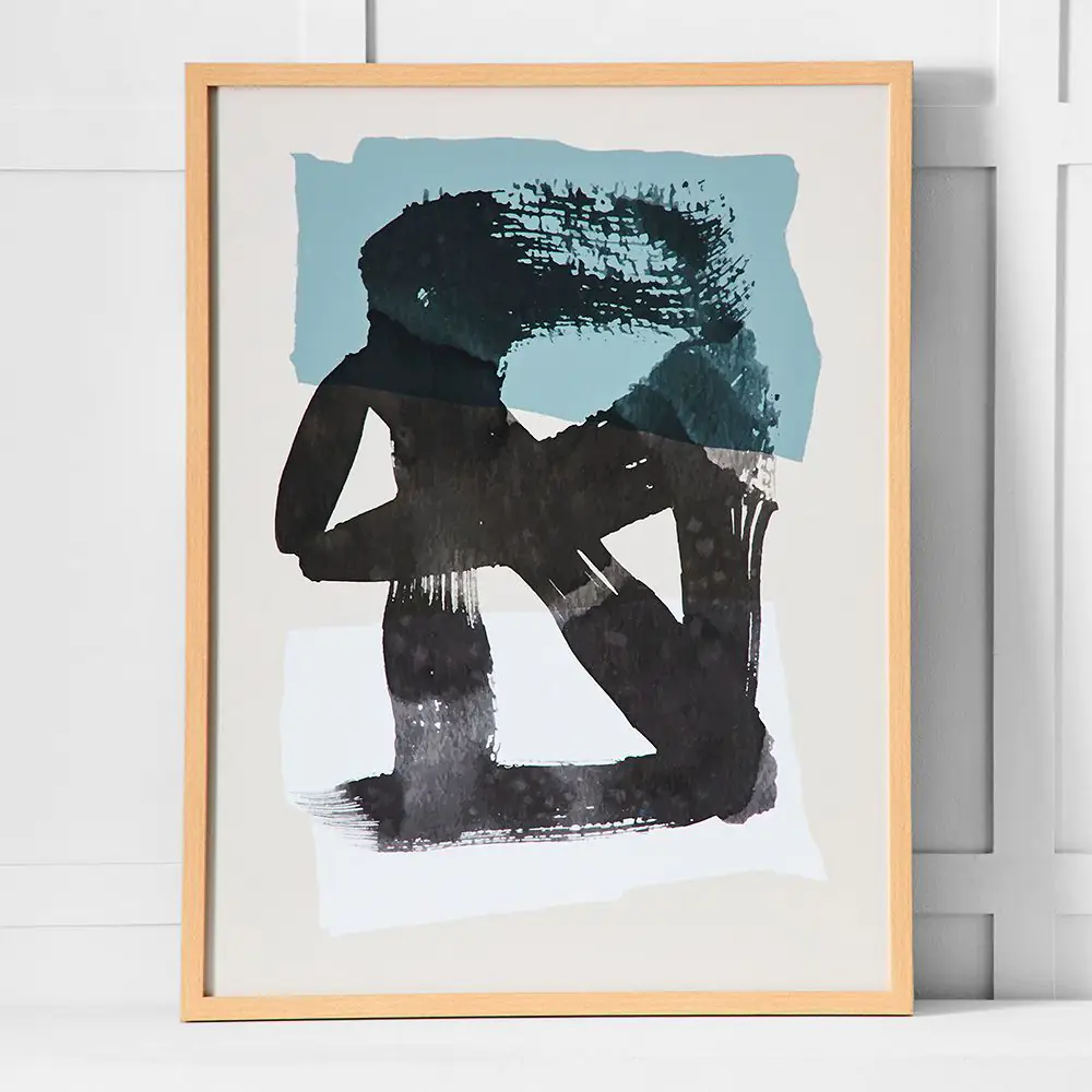 A stunning abstract print featuring fluid black brushstrokes over soft blue and white rectangular shapes, elegantly framed and sizable enough to command attention without dominating the space.