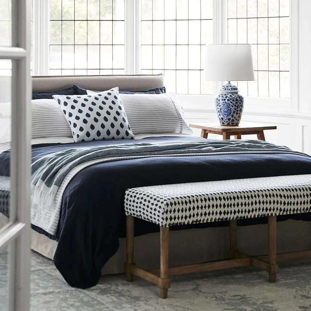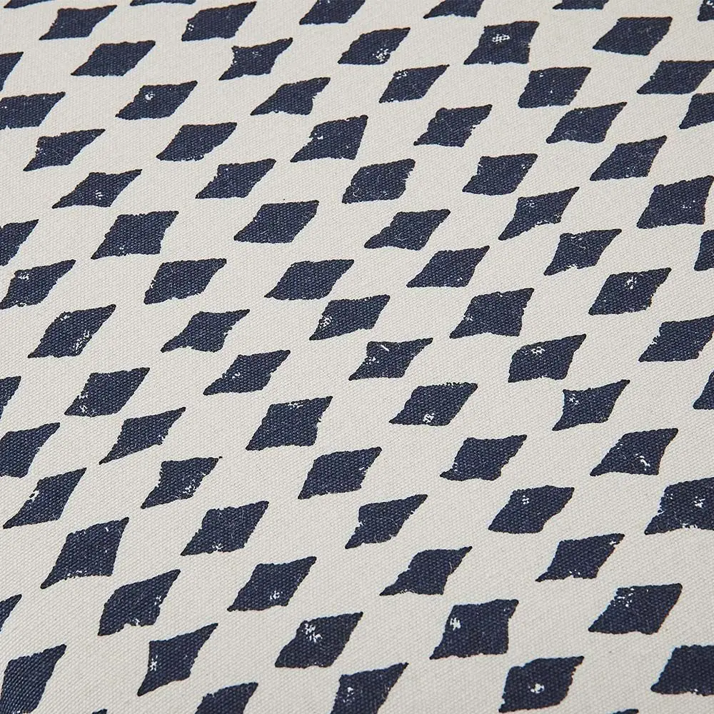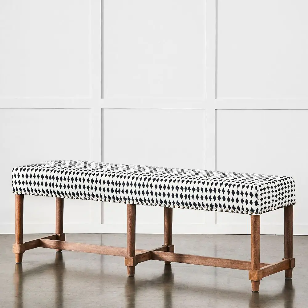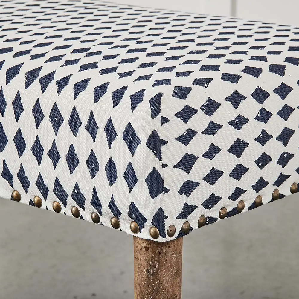 This Khadi bench is a beautiful combination of traditional and contemporary. The modern navy and white upholstery complemented by the traditional brass studding transcends styles and enables it to work with any furniture style.