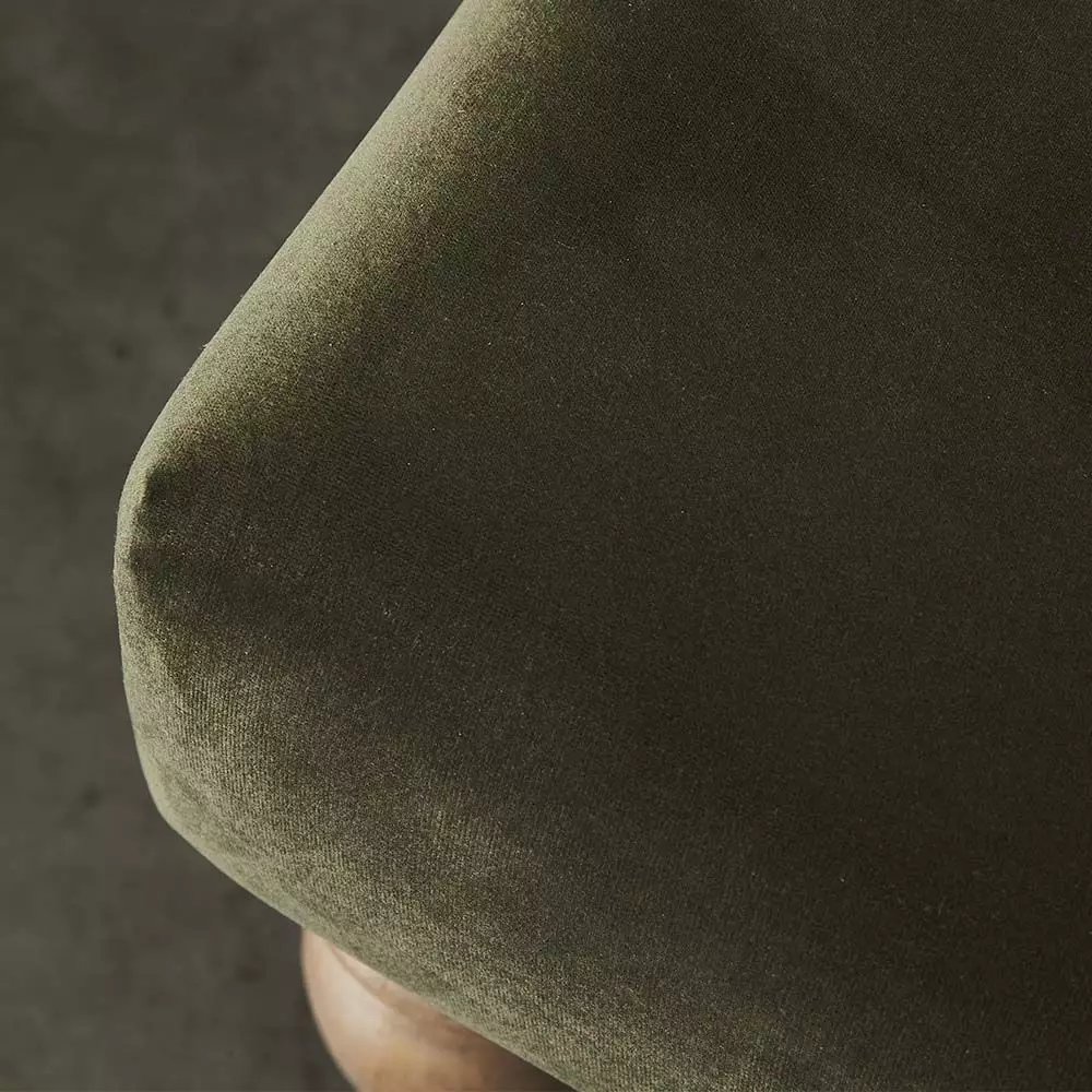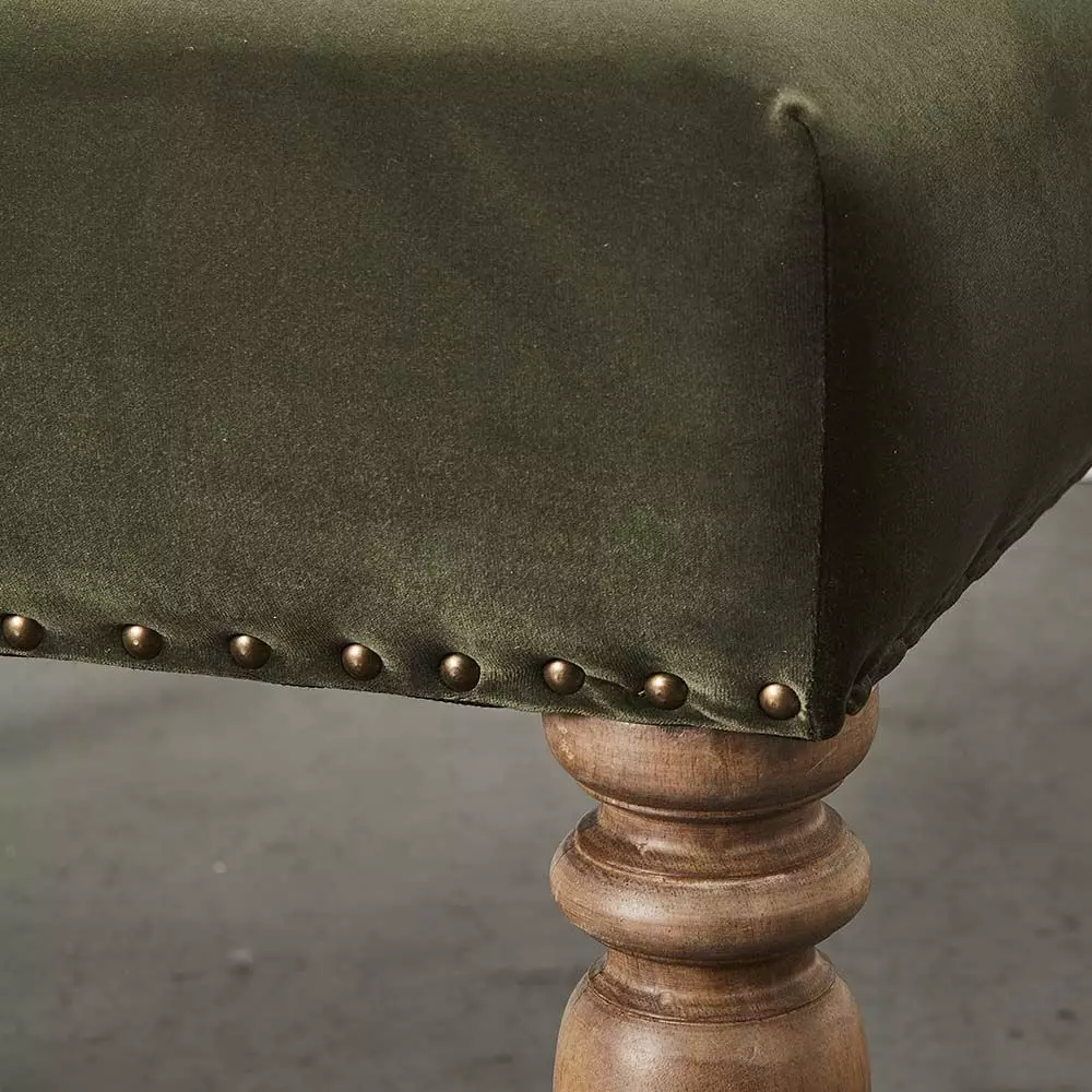 The Khadi ottoman is a versatile piece of furniture – it can be used as an ottoman or a coffee table. The legs are beautifully crafted from sustainable mango wood and left with a raw, natural finish. The top is upholstered in a luxurious velvet with brass studding and filled with quality foam and poly fibre. It will easily find a place in any room.