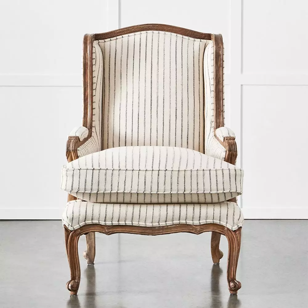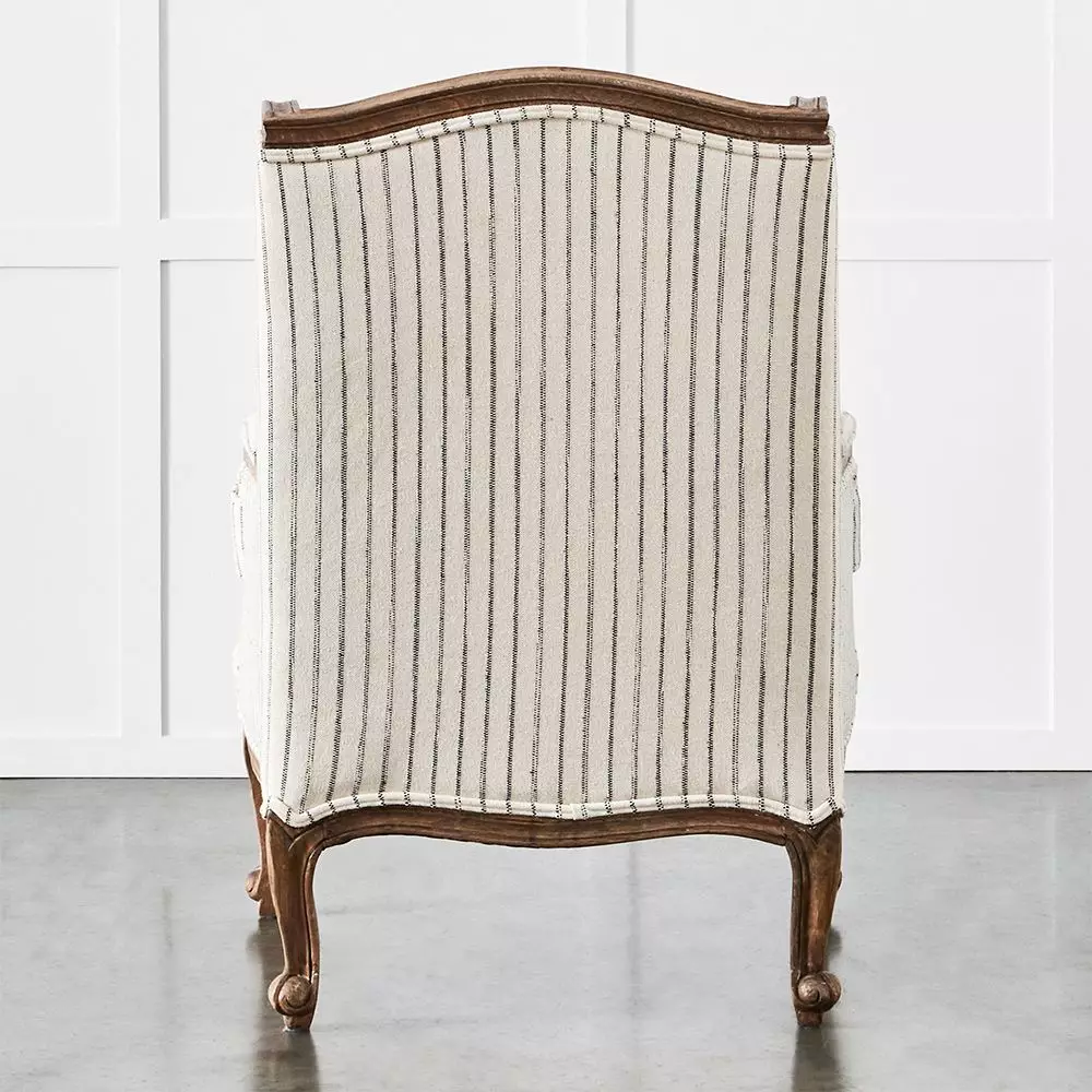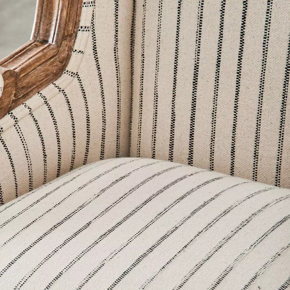 It is upholstered in a natural coloured cotton with a stripe created by raised black stitching, adding extra texture to the fabric. The chair is supremely comfortable with cushioning made from top-quality foam surrounded by poly fibre.