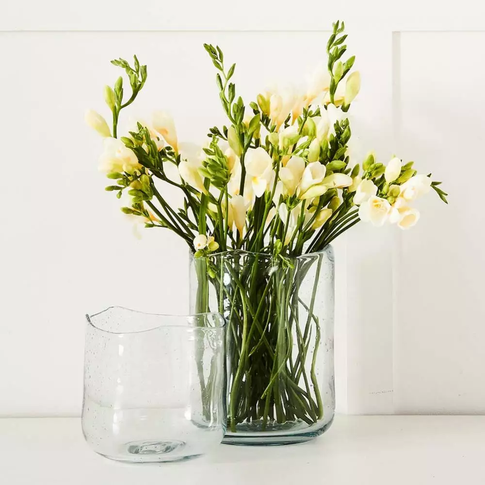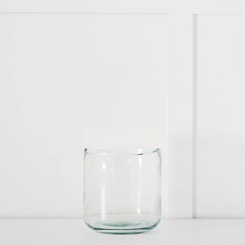 A beautiful clear glass vade with an irregular top which mimics a handblown vessel.