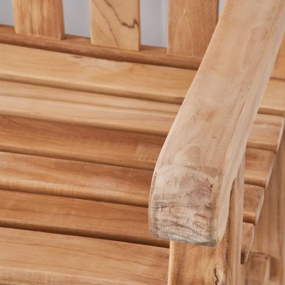 Expertly crafted from premium natural teak wood, this bench showcases a rich wood grain and a sophisticated slatted design. The contoured back and seat work in harmony with the elegantly curved armrests to provide superior comfort and support. Teak is highly regarded for its exceptional durability and high oil content, making it naturally resistant to moisture, insects, and decay even in harsh environments.