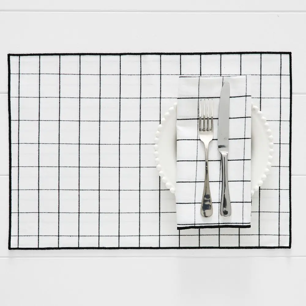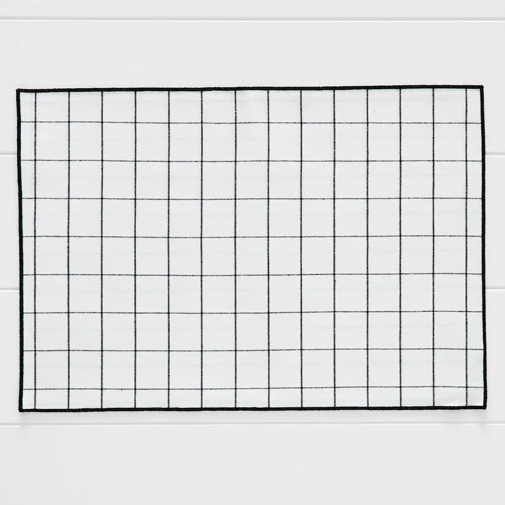 The 100% yarn-dyed cotton placemat in white features a fine black check pattern and is finished with black overlocked edges, adding elegance to any table setting. The high-quality cotton and precise detailing enhance its appeal while contrast between the white background and black lines creates a sophisticated visual impact, making it suitable for casual meals and formal gatherings.