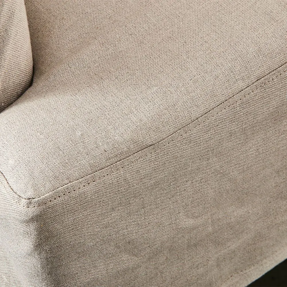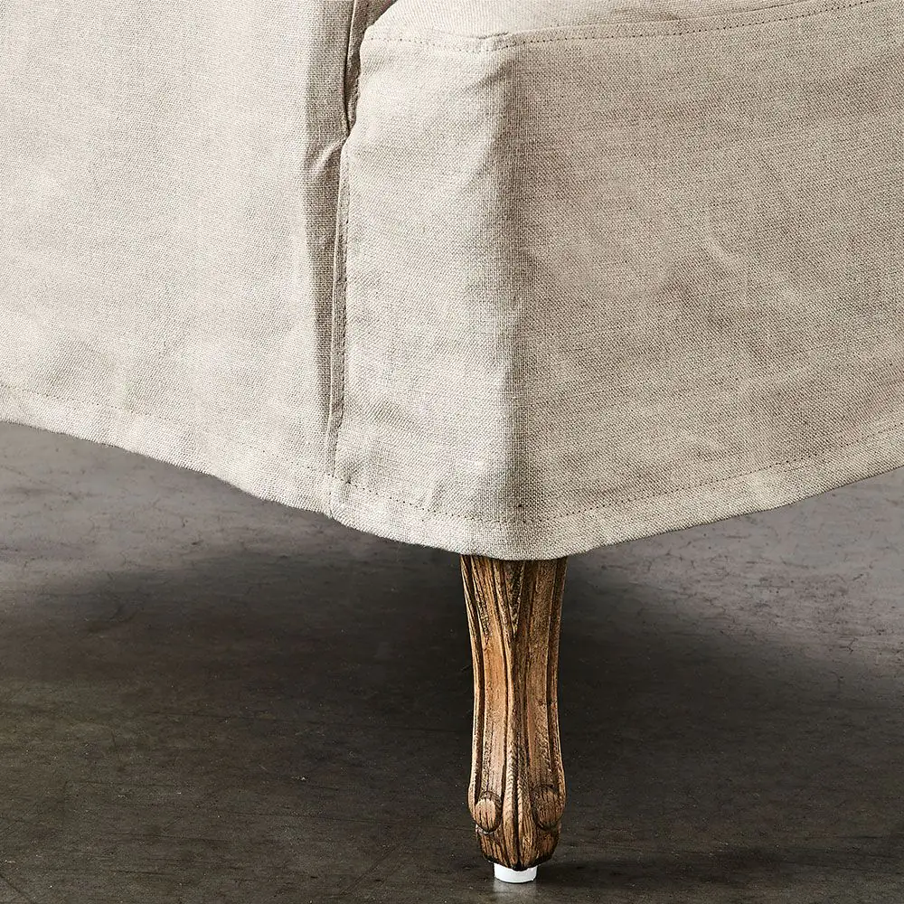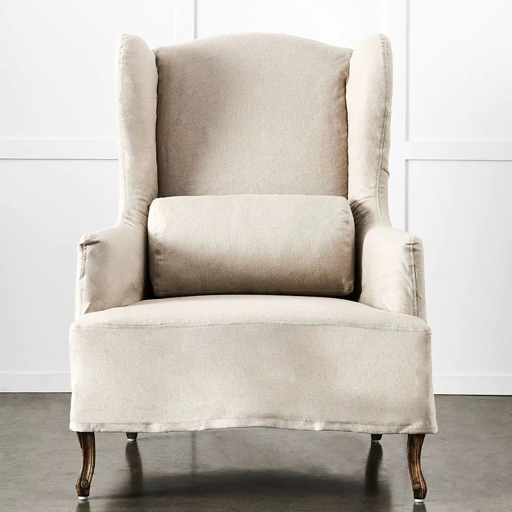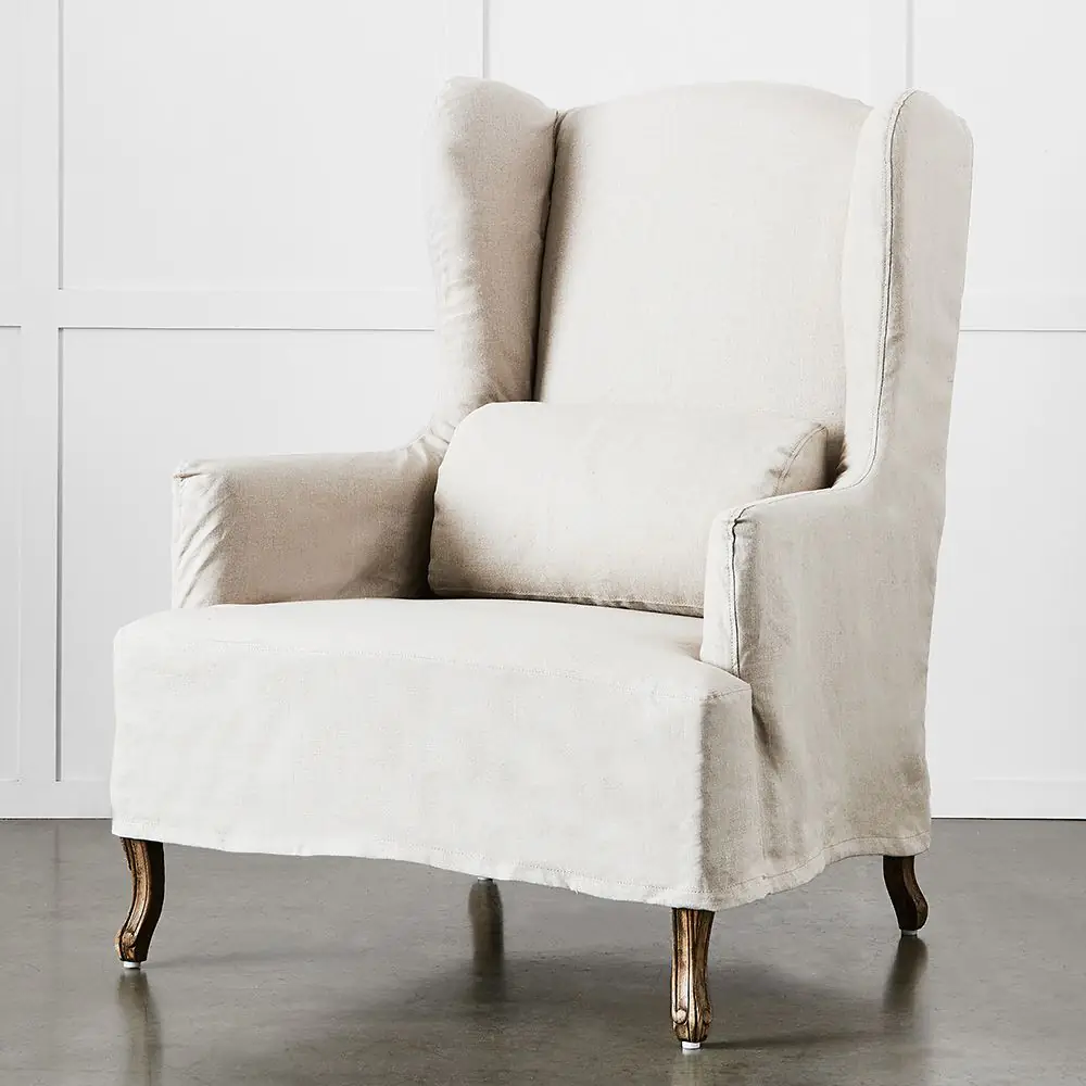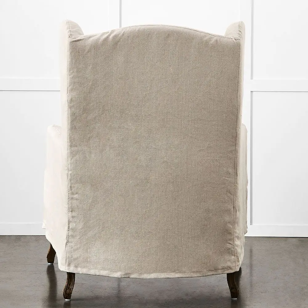 The Ludwig is an elegant mid-sized wingback chair with our signature French style frame and legs but with a twist. It has a removable slipcover in a lovely natural linen fabric which covers the frame but leaves the intricately carved American oak legs visible. The matching lumbar cushion adds to the comfort of the chair as does the top-quality foam used for the padding.