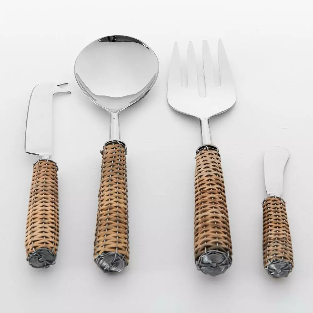 Add some tropical glamour to your table with these wicker salad servers. A matching cheese knife is available.