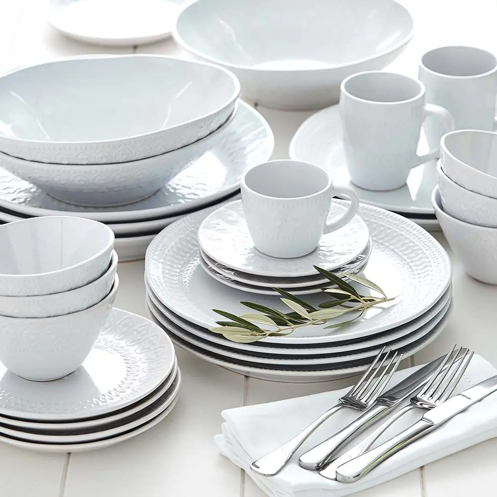Our beautifully embossed stoneware crockery in crisp, classic white brings effortless style to any table setting. Each piece features delicate, textured detailing that adds subtle interest without overpowering your dining look. Perfect for everyday meals or special occasions, this crockery adds a timeless touch of sophistication to every gathering.