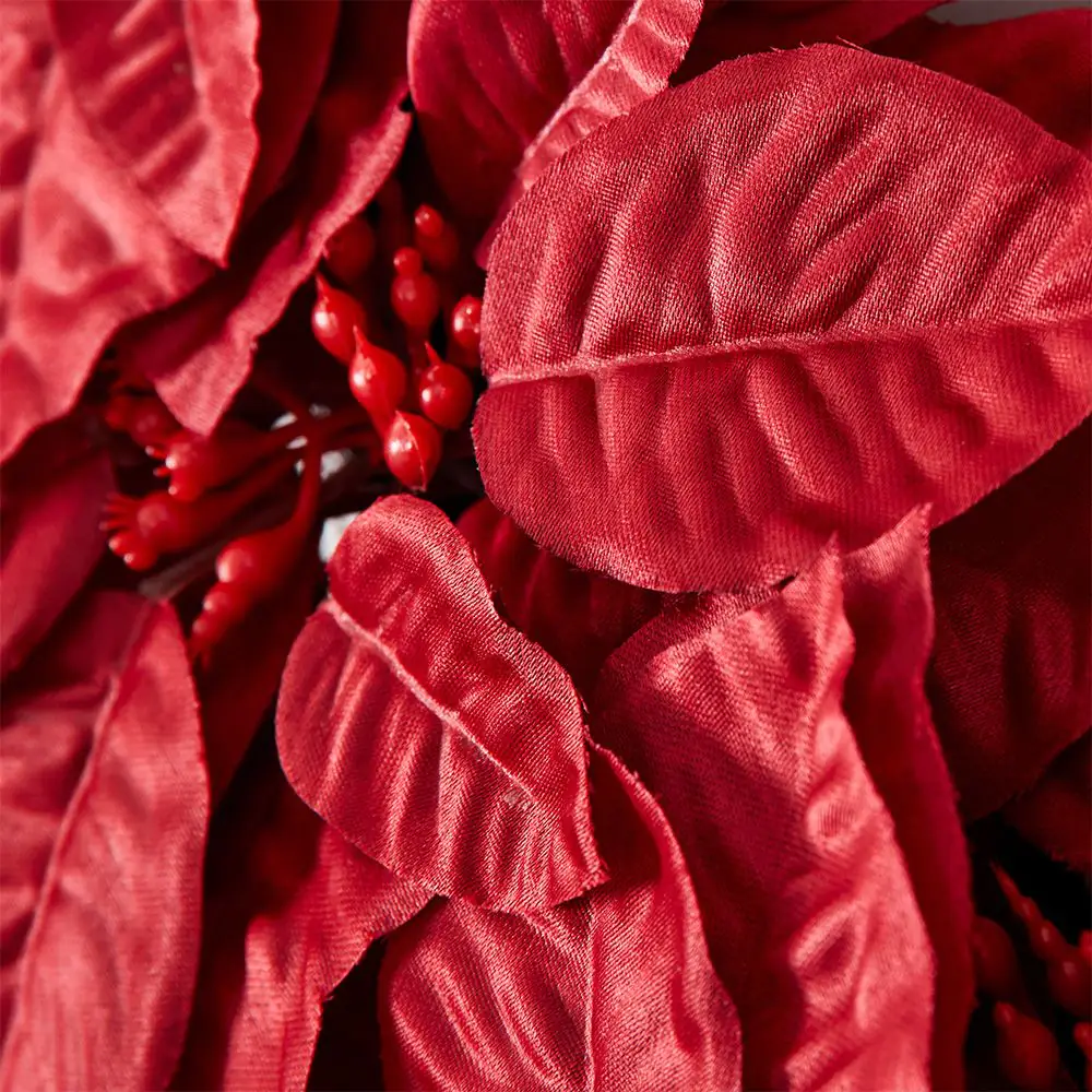 This wreath features a lush arrangement of vibrant red poinsettia blooms, meticulously crafted to mimic the velvety texture of the iconic Christmas flower. The deep crimson petals provide a rich, high-impact look that stands out beautifully against any backdrop.