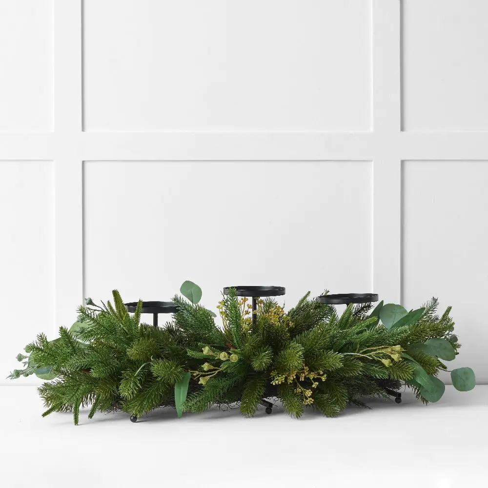 This centrepiece features a rich tapestry of textures, including lifelike evergreen pine needles, soft silver-dollar eucalyptus leaves, and clusters of vibrant red winter berries. The deep green foliage provides a natural backdrop for the three integrated black iron candle stands, creating a balanced and elegant display for your home.