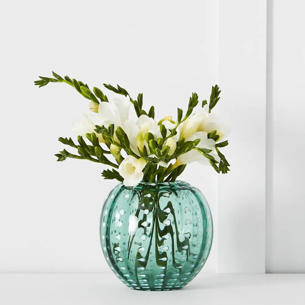 A pretty textured glass vase decorated with delicate white dots. Add one to your vase collection.