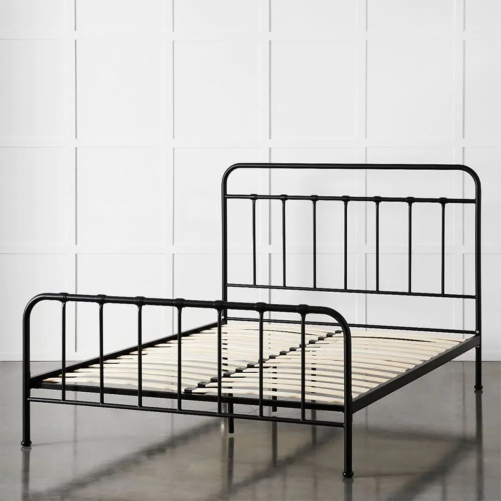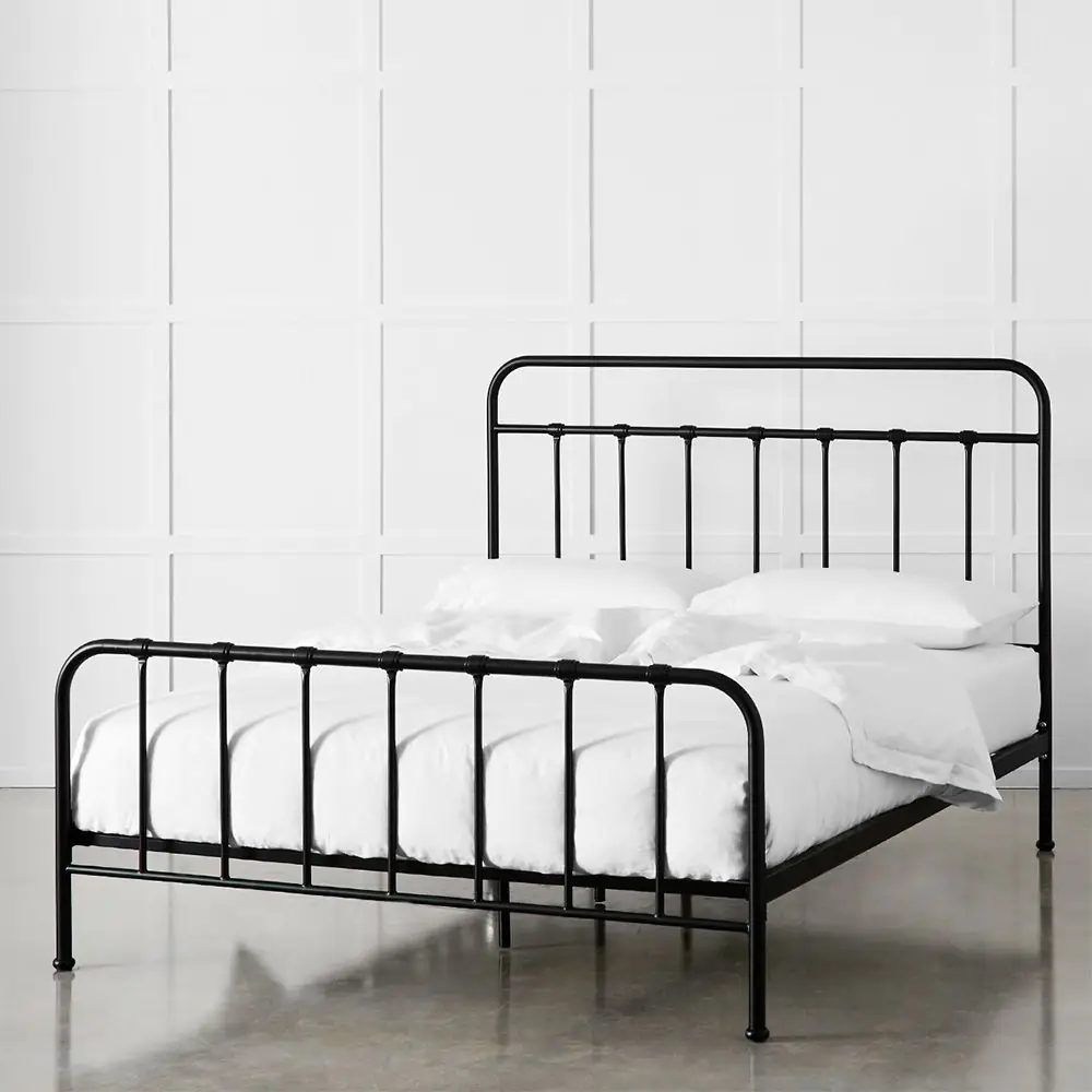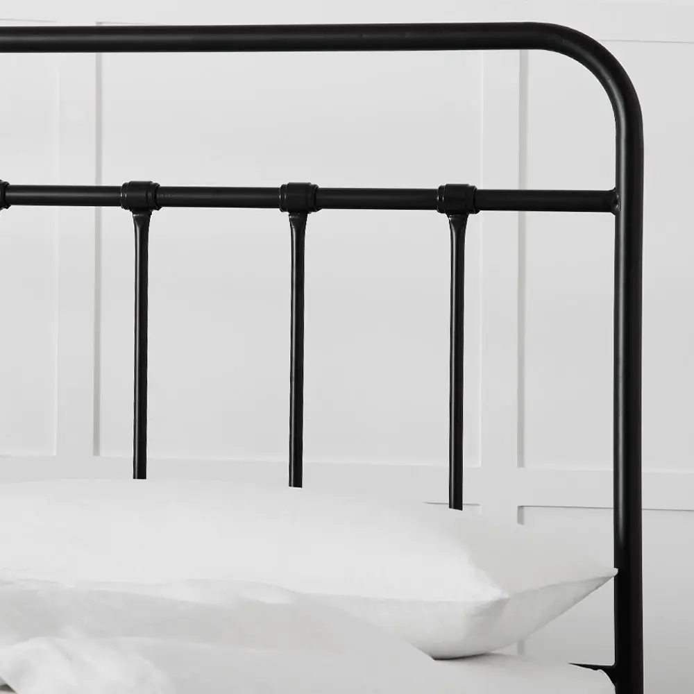 This elegant iron bed blends vintage charm with modern durability. The black powder-coated finish enhances its sleek, timeless design while providing excellent resistance to wear. The sturdy frame, featuring delicate vertical bars and curved edges, adds a touch of classic sophistication to any bedroom. A robust timber-slatted base ensures optimal mattress support and comfort. Whether styled with crisp linens for a minimalist look or layered with plush bedding, this bed is a stylish and practical addition to any home.