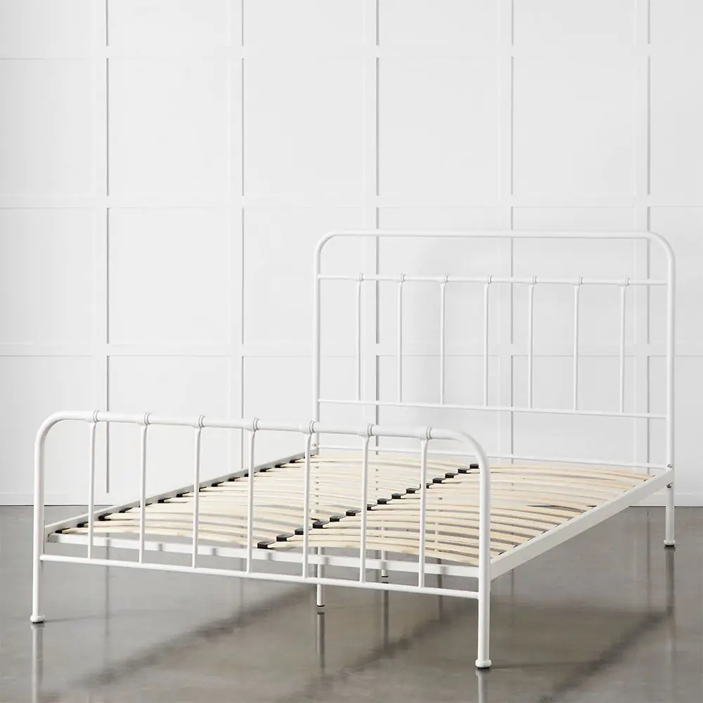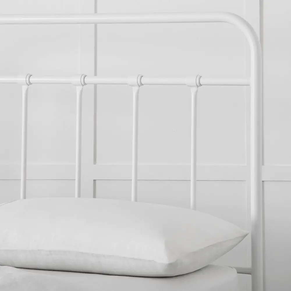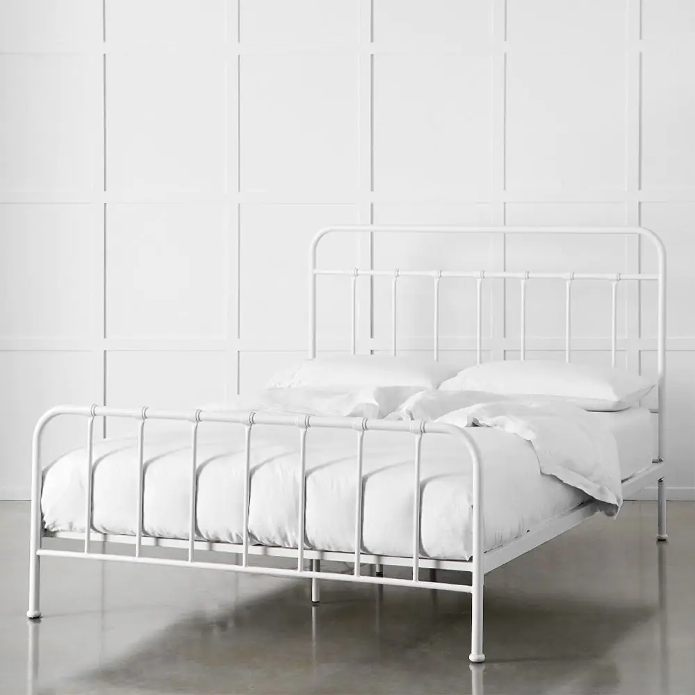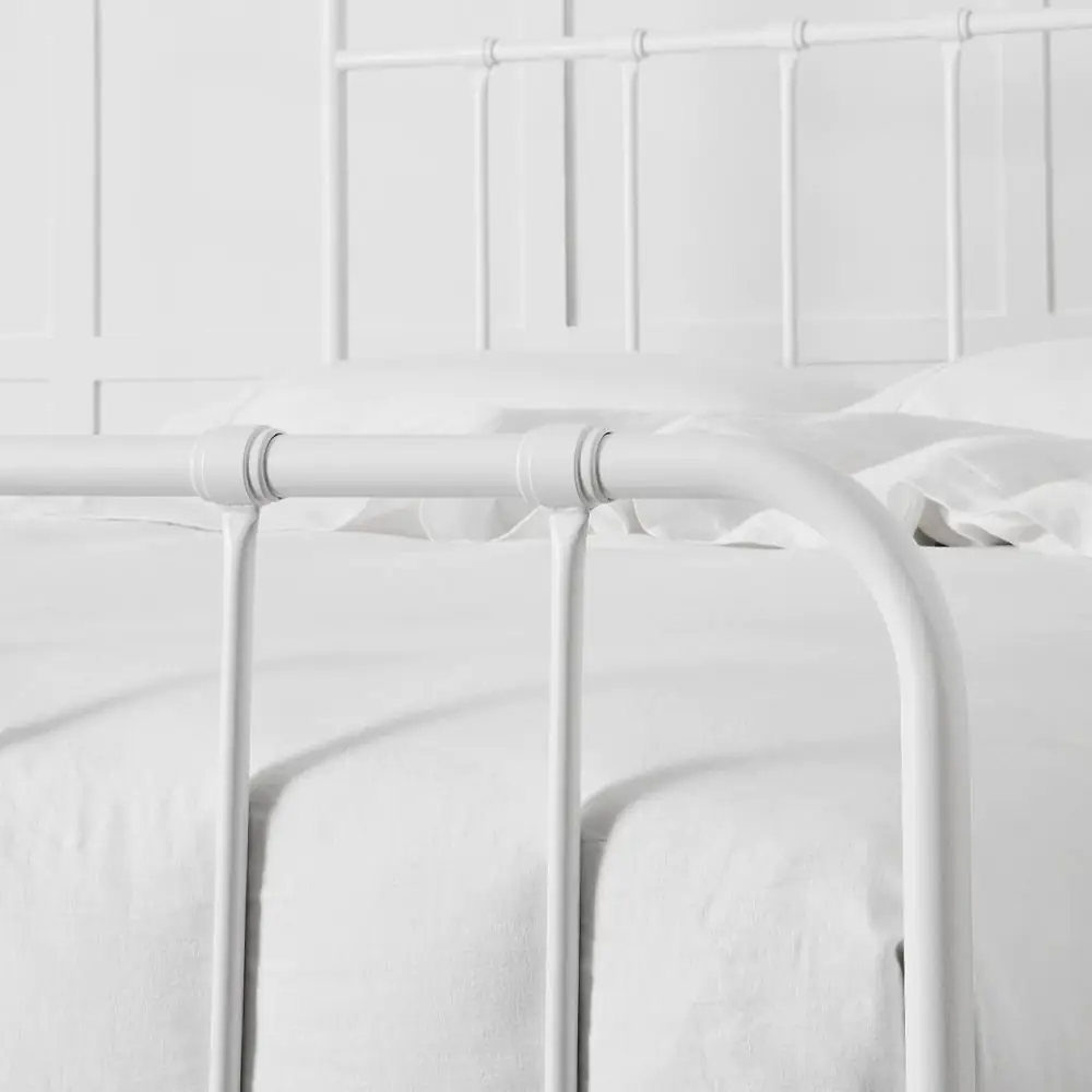 This elegant iron bed blends vintage charm with modern durability. The white powder-coated finish enhances its sleek, timeless design while providing excellent resistance to wear. The sturdy frame, featuring delicate vertical bars and curved edges, adds a touch of classic sophistication to any bedroom. A robust timber-slatted base ensures optimal mattress support and comfort. Whether styled with crisp linens for a minimalist look or layered with plush bedding, this bed is a stylish and practical addition to any home.
