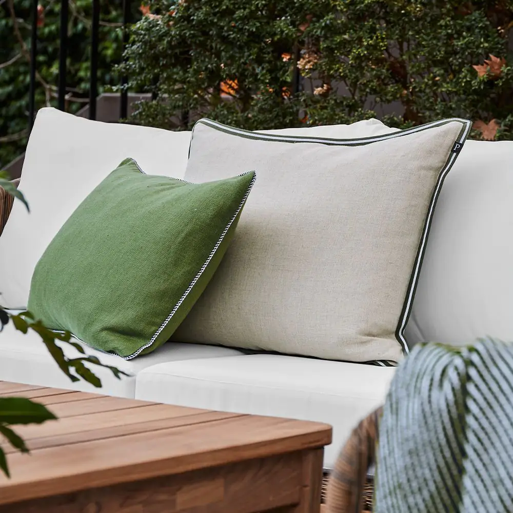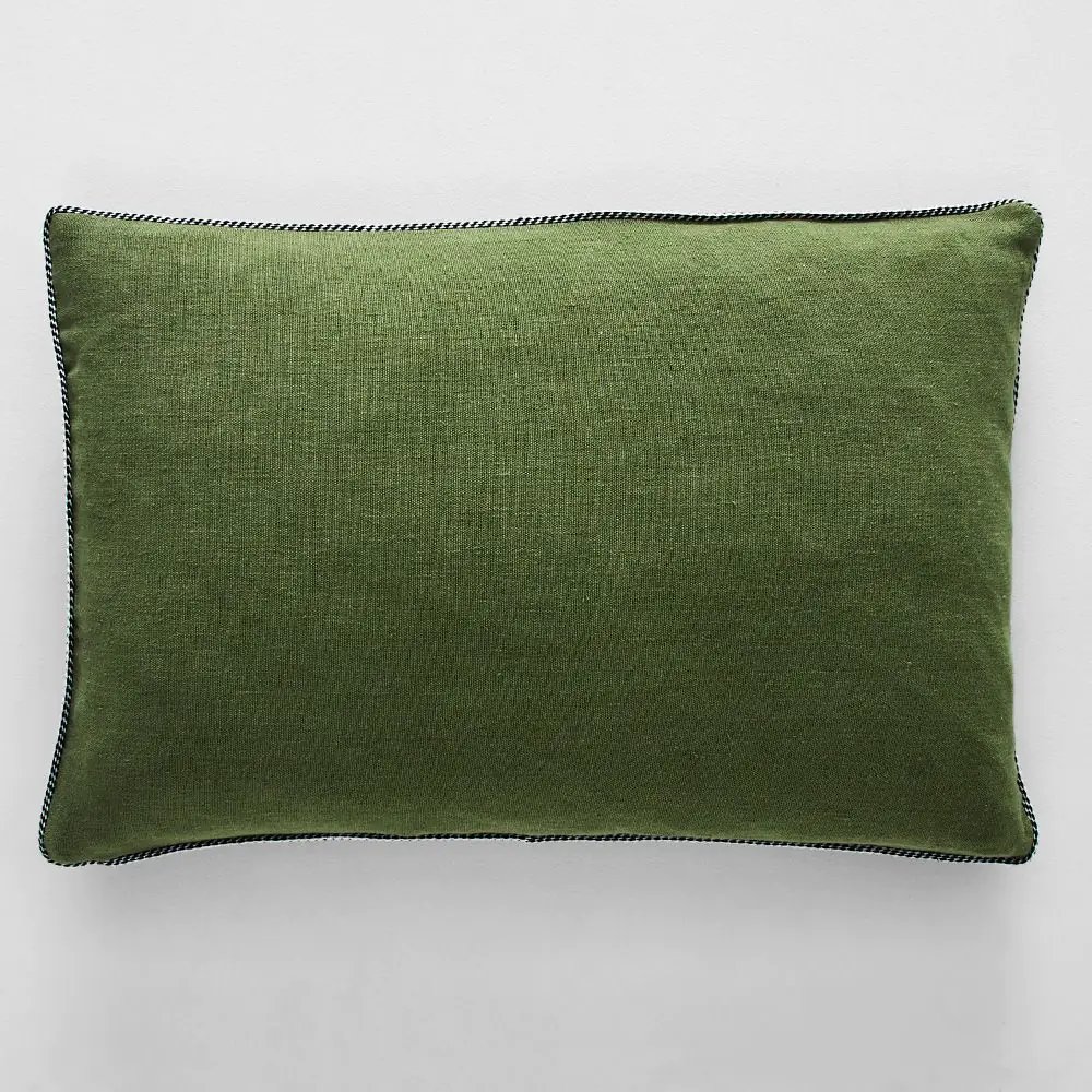 Cushions are the easiest way to change the look of your living room or bedroom. Change some or all of them seasonally for a brand-new look. This forest green linen cushion cover has a fresh navy and white trim around the edges – it’s simple and stylish. The cushion is completed with a luxurious 100% duck feather insert