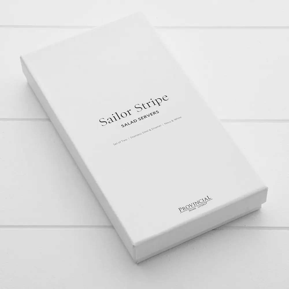 Our boxed salad server set is crafted from stainless steel with navy and white sailor stripe enamel-coated decals, adding a touch of charm.