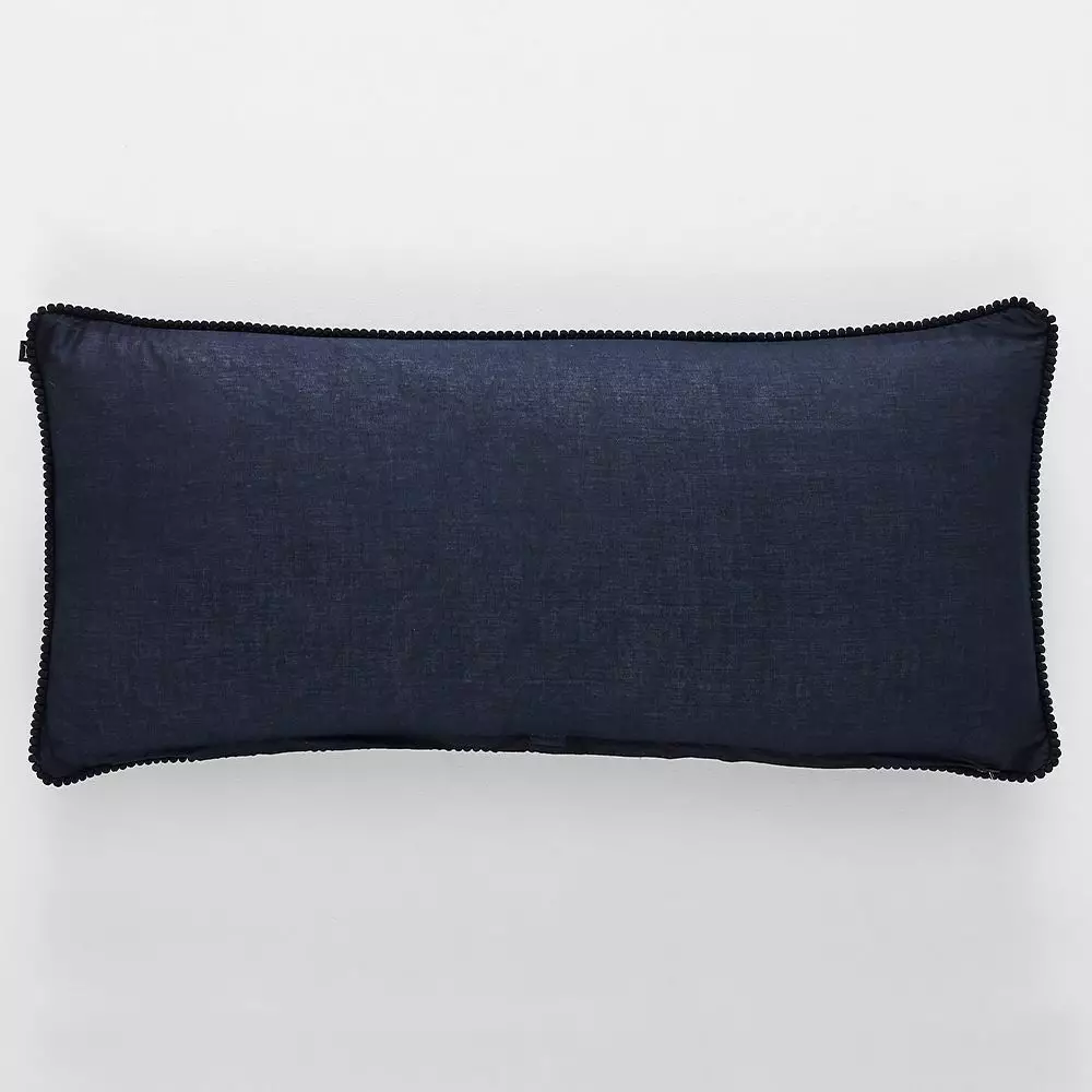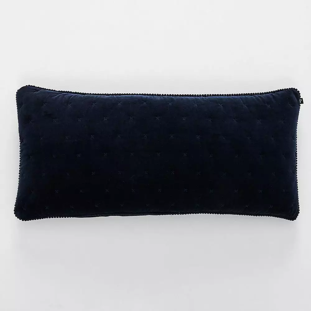 A luxurious long velvet cushion in a sophisticated ink blue with a decorative edge and cross stitch tucking for added texture.