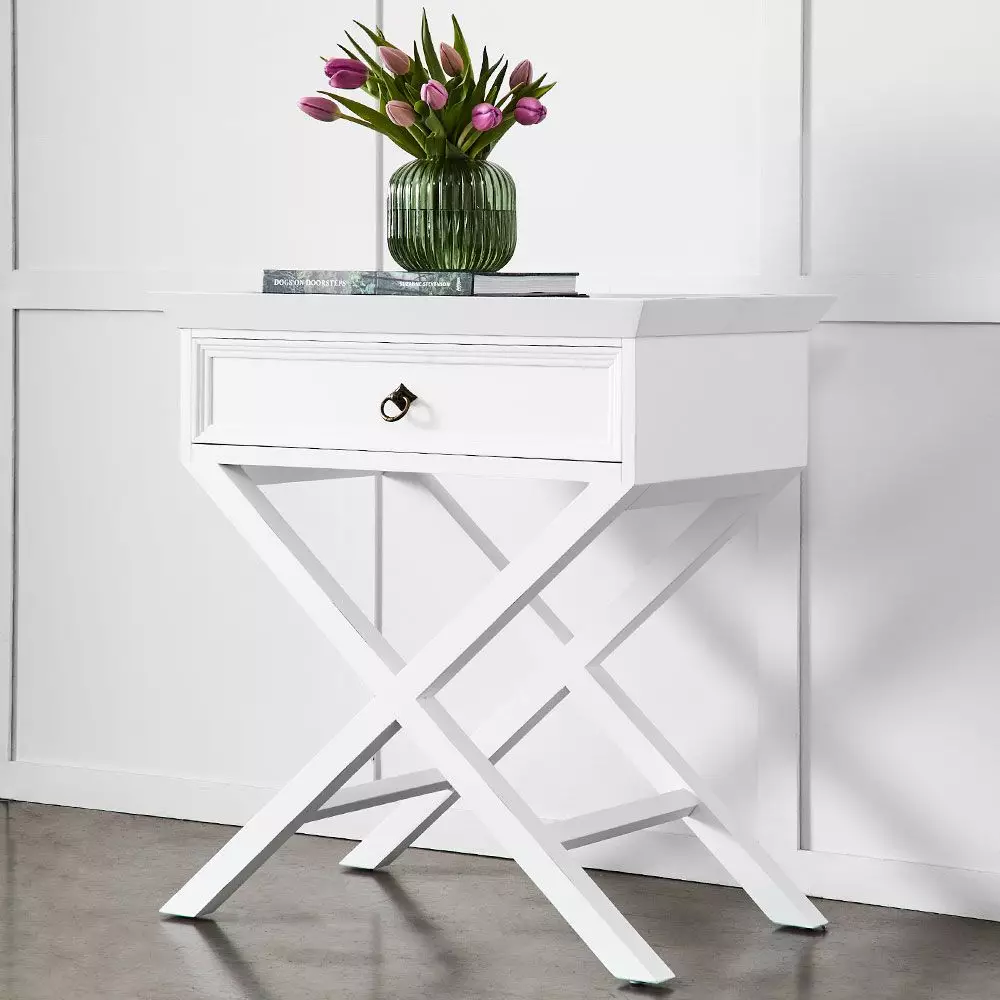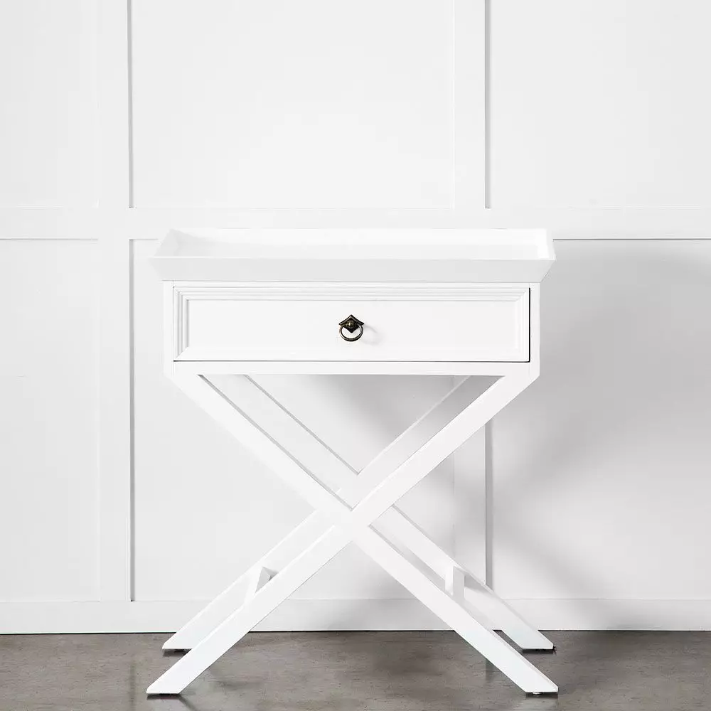 It looks very similar to a butler’s table but the top is attached to the crossed legs so it is very stable. The crisp white painted poplar with a gentle