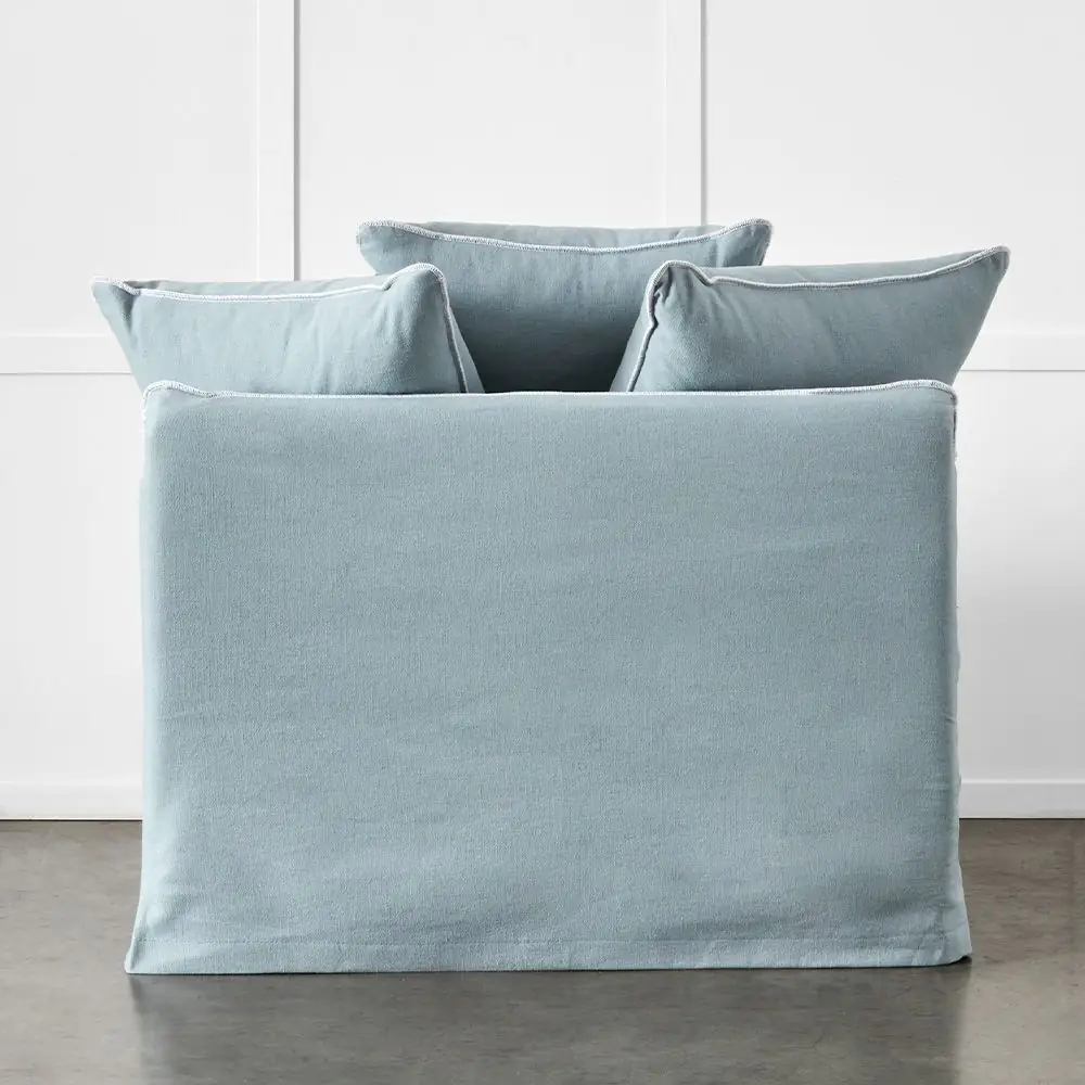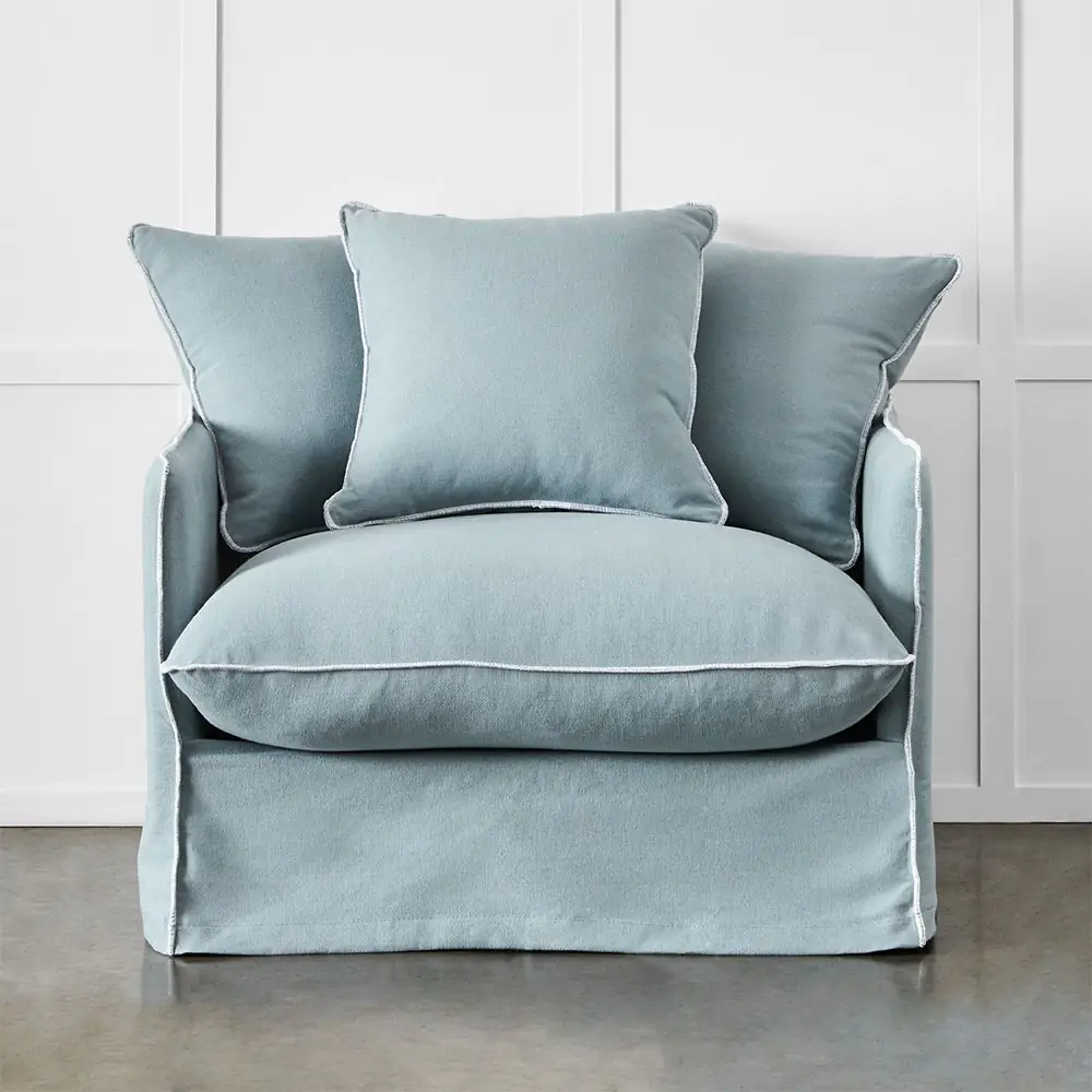 The Sorrento is a casual armchair with an oversized seat cushion and three matching throw cushions. The frame is made from Canadian pine, steel springs, the foam cushioning is covered with a mixture of feather and polyester fibre for an extra comfortable seat. The covers are finished with a decorative white overlock stitch. All covers and cushions can be removed for professional dry cleaning.