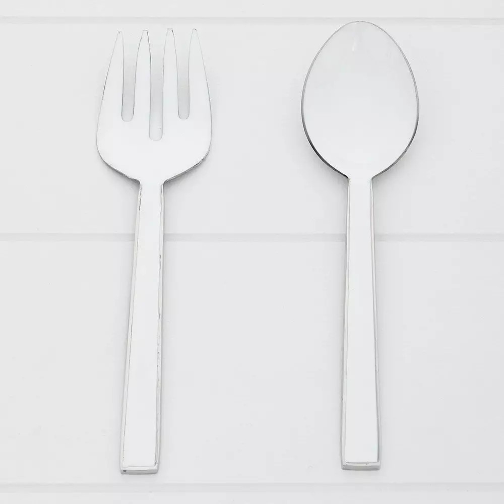 A classic set of salad servers combining stainless steel with food safe enamel.